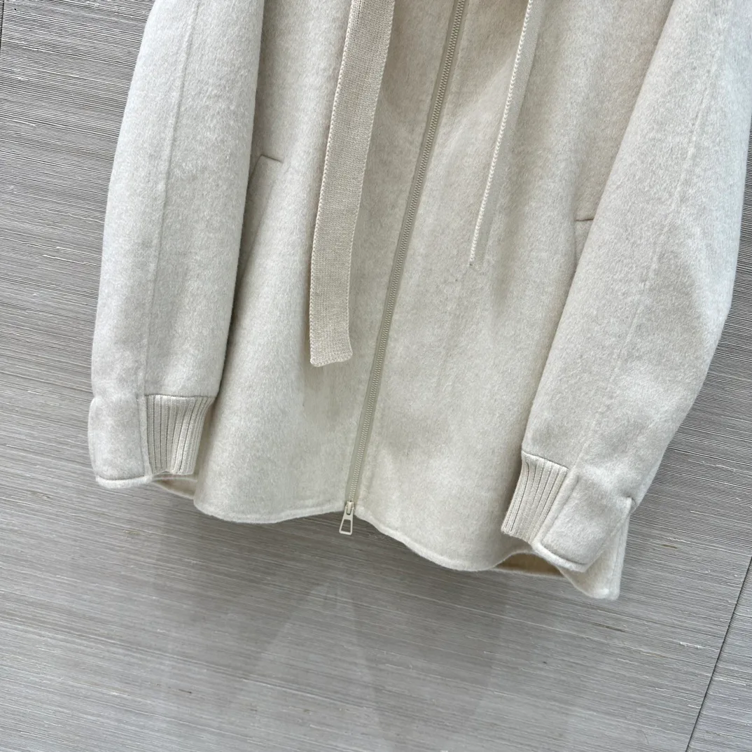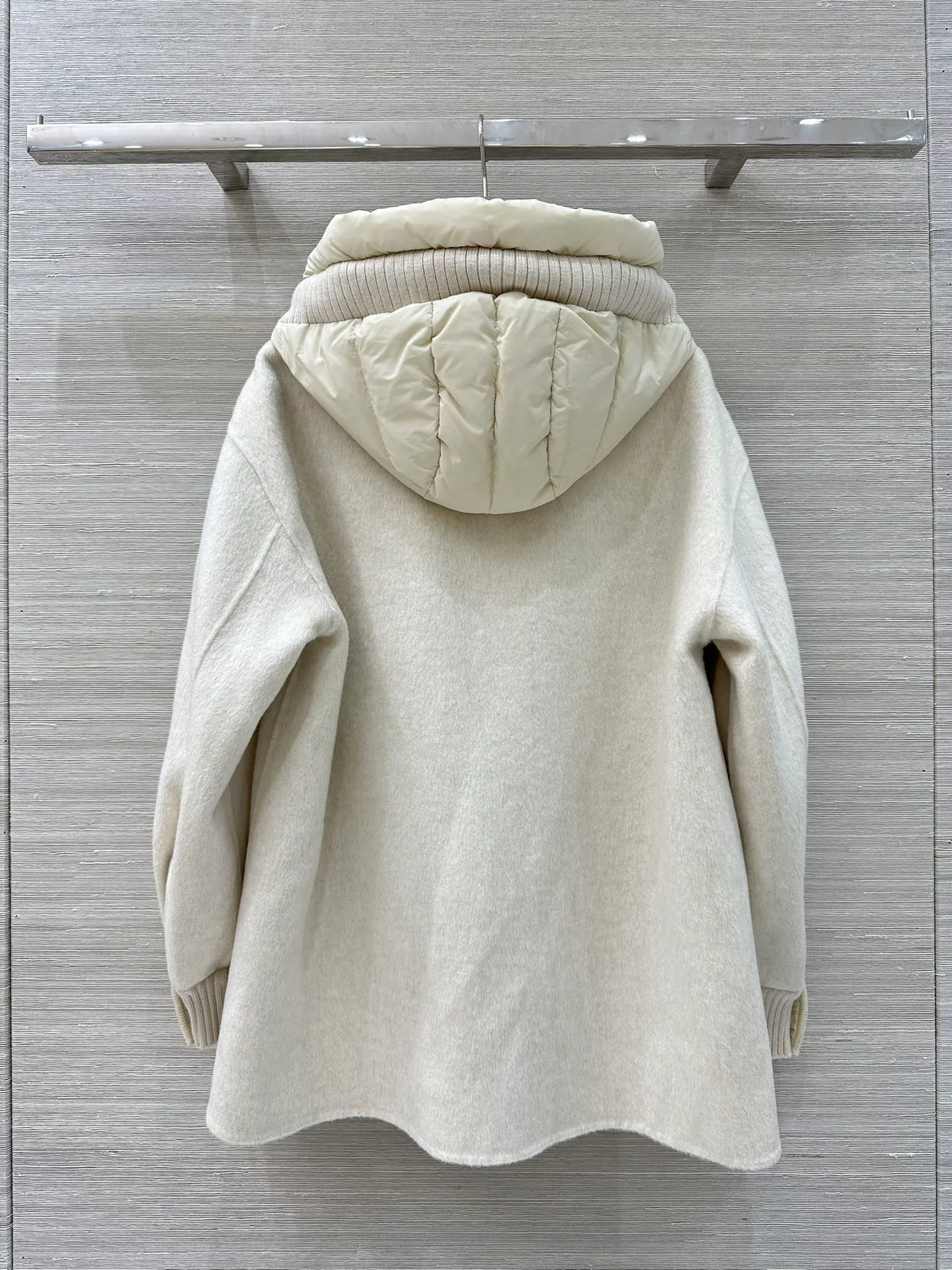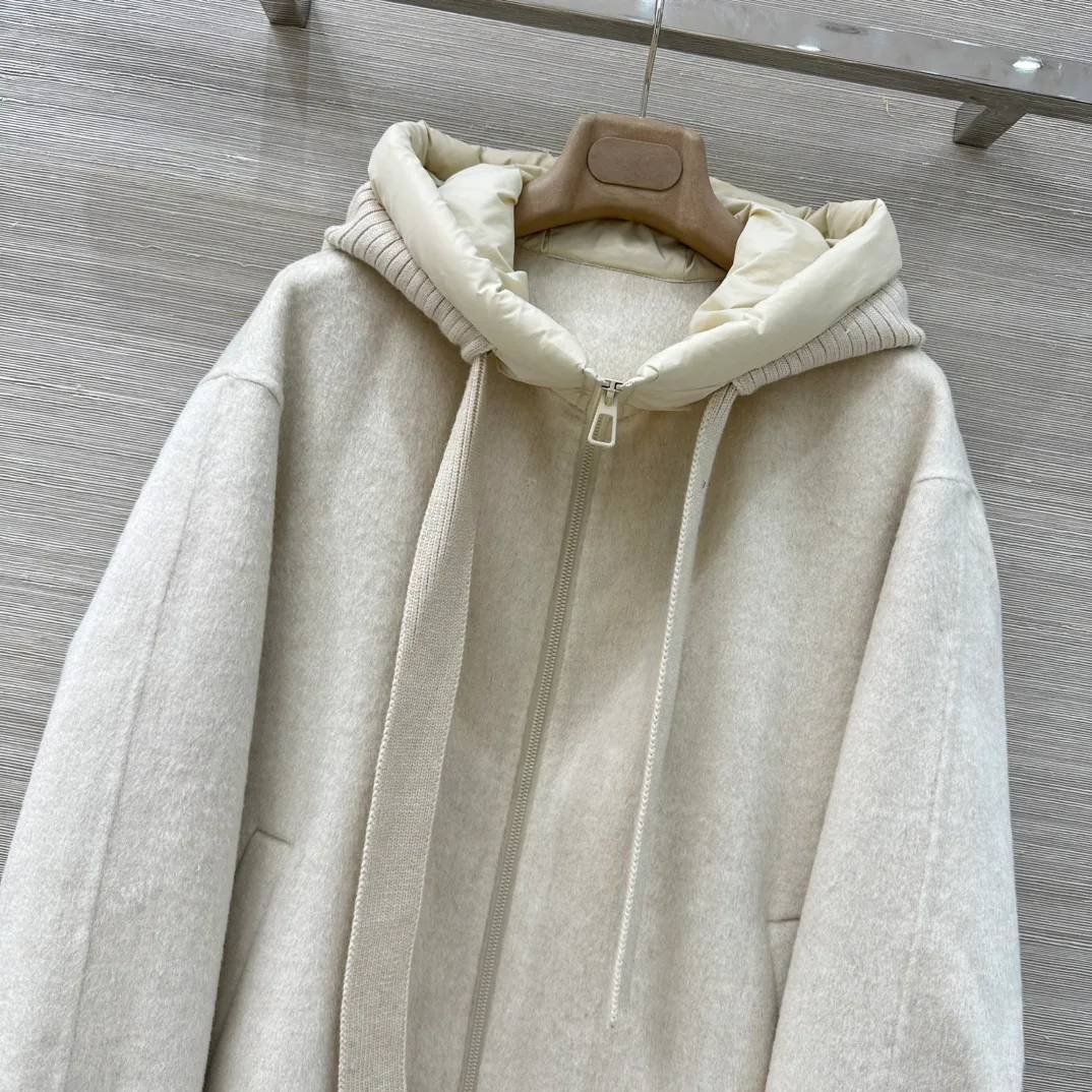 Особенности: двойной дизайн из кашемира и шерсти, панели с контрастом, трёхмерный крой, наполнение — 90 белого гусиного пуха, легкость и тепло, ручная подгонка стежков. Фасон свободный, слегка оверсайз; стиль — элегантный и интеллигентный, капюшон защищает от ветра и непогоды.