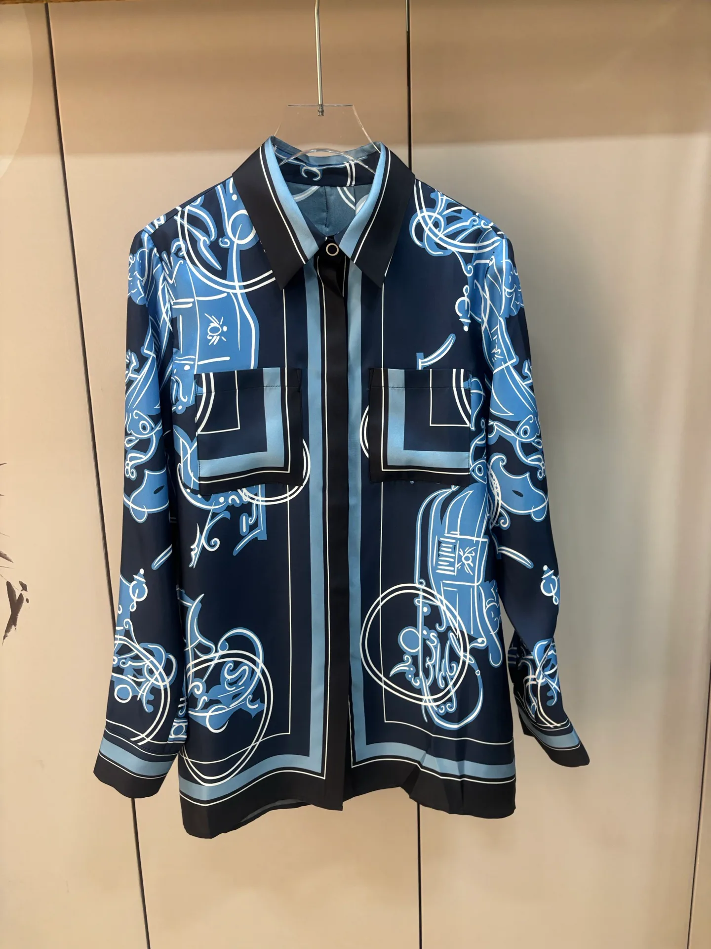 Рубашка женская HERMES — модель из шёлковой ткани саржа плотностью 19 ммм с позиционным принтом, обеспечивающим единообразие рисунка. Материал обладает благородным блеском и сохраняет форму благодаря структуре полотна. Дизайн отличается аккуратным отложным воротником и скрытой застёжкой на пуговицы, создавая сдержанный и элегантный силуэт. Симметричный узор выполнен чётко, что подчёркивает внимание к деталям. Рубашка подходит для самостоятельного ношения или в сочетании с жакетом.