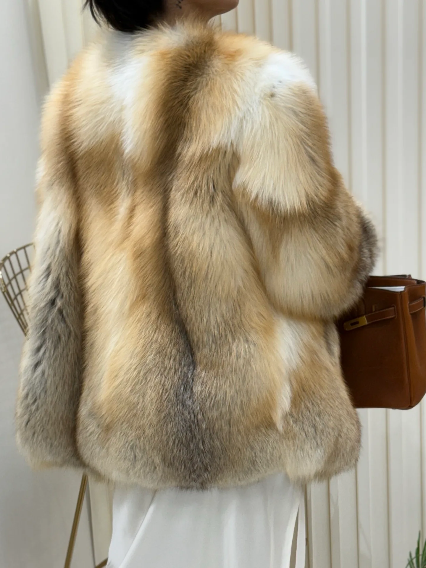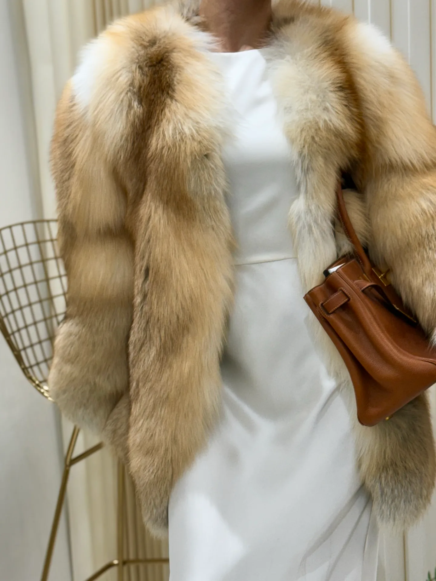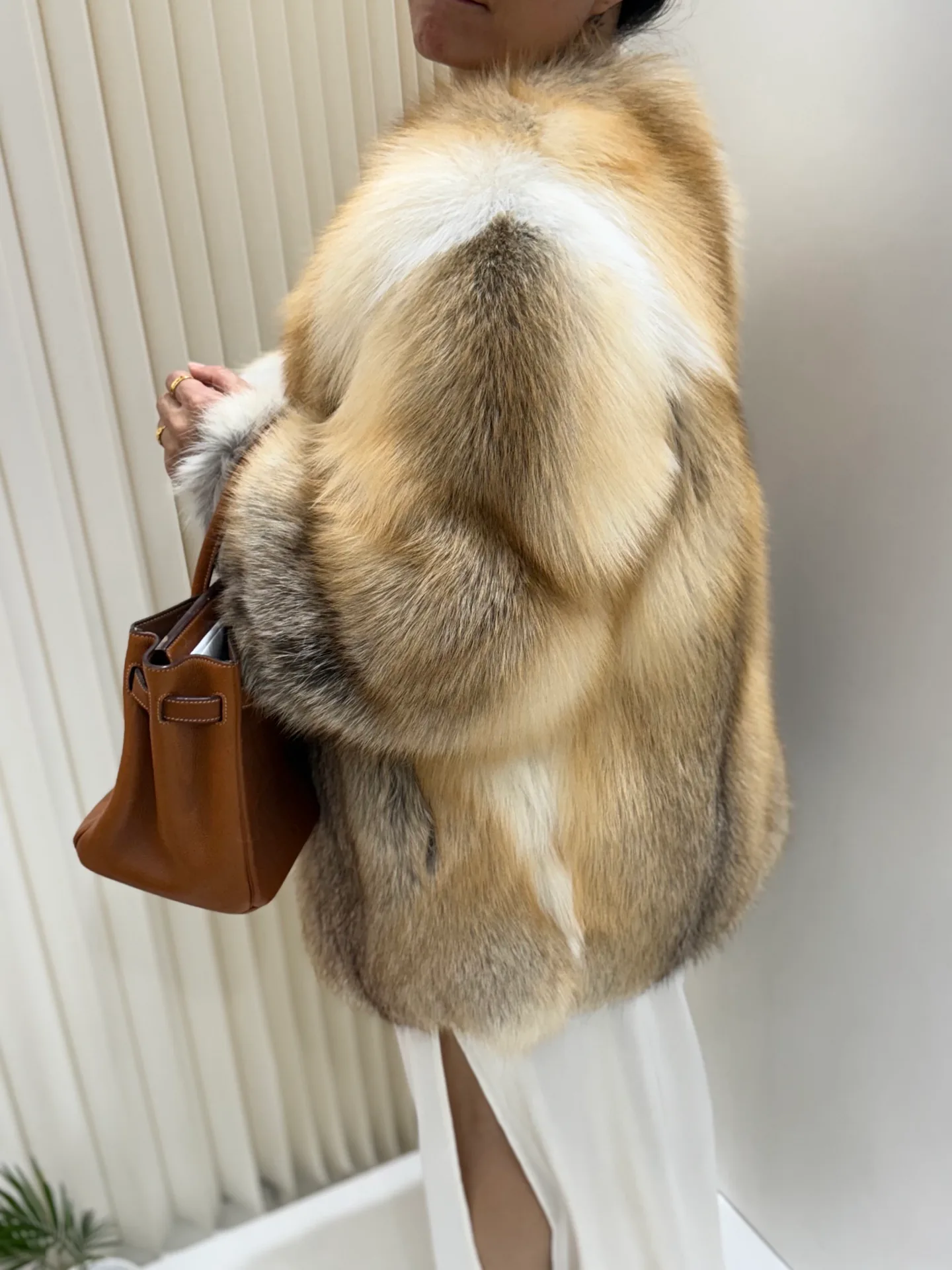 Основной акцент дизайна лежит на цельности мехового покрытия, что отражает концепцию объединения меха и кожи. Шуба подходит для сочетания с нейтральной цветовой гаммой и отлично смотрится с однотонными вещами в бежевых, серых или черных тонах. Мех требует профессиональной очистки и бережного обращения.