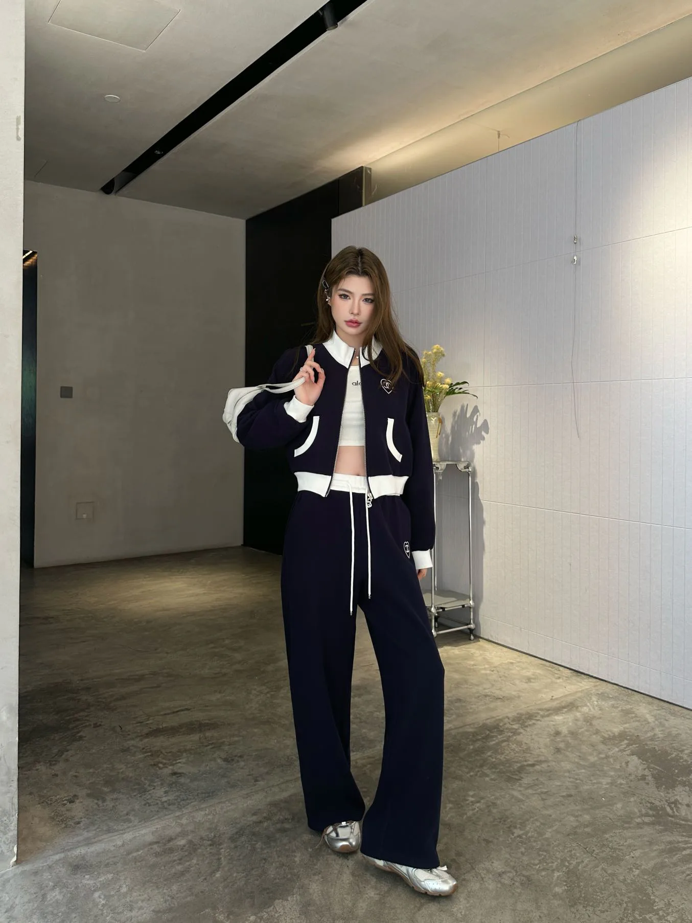 Спортивные костюмы женские CHANEL — модель из ранней весенней коллекции включает застёгивающуюся на молнию куртку с воротником-стойкой и брюки с высокой талией. Комплект отличается лаконичным силуэтом с белыми контрастными вставками и узнаваемой вышивкой в виде сердца с монограммой. Тщательно проработанная вышивка расположена на груди и на штанинах. Костюм подходит для повседневной носки, дома или для лёгких физических занятий. Его можно комбинировать с кроссовками или другой удобной обувью.