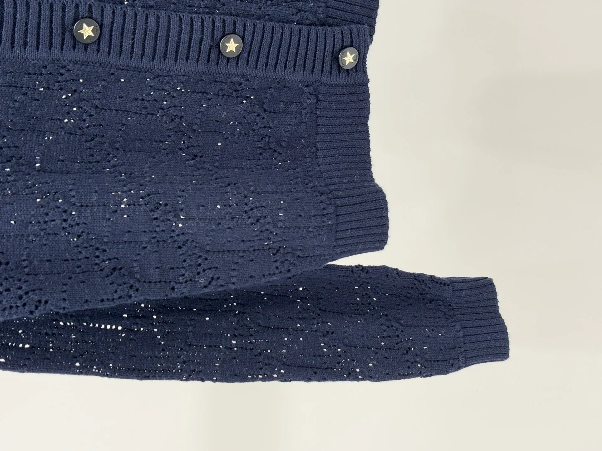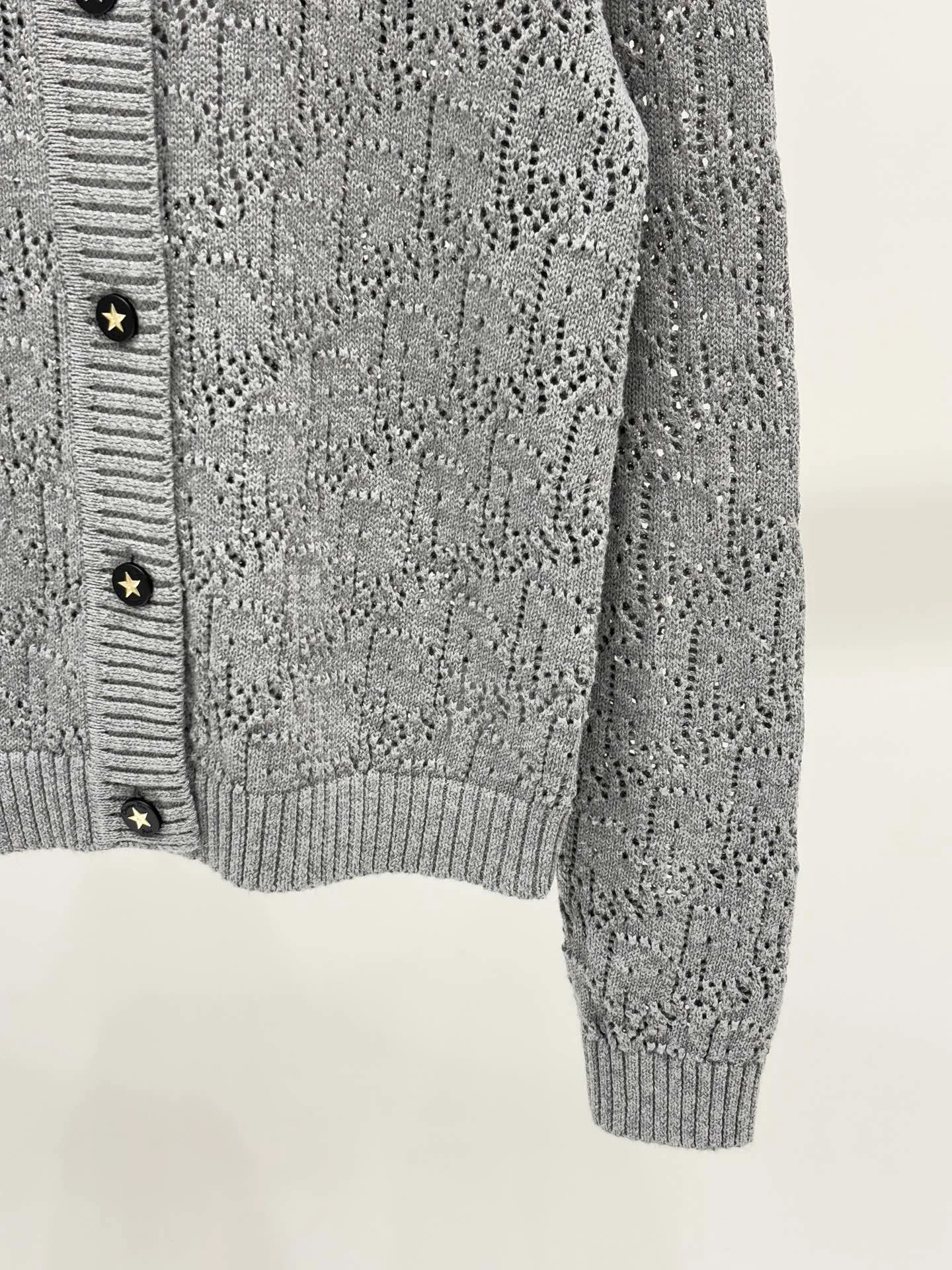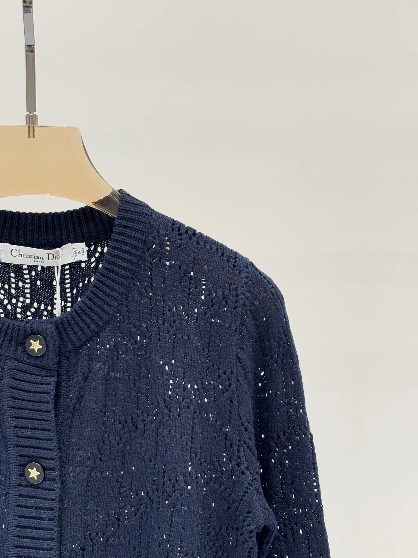 Кардиган имеет круглый вырез, аккуратно ложится на плечи и подходит для повседневного гардероба. Открытая вязка улучшает воздухопроницаемость и придаёт легкость образу. Модель доступна в белом, сером и темно-синем цветах, а размерный ряд включает S, M и L.