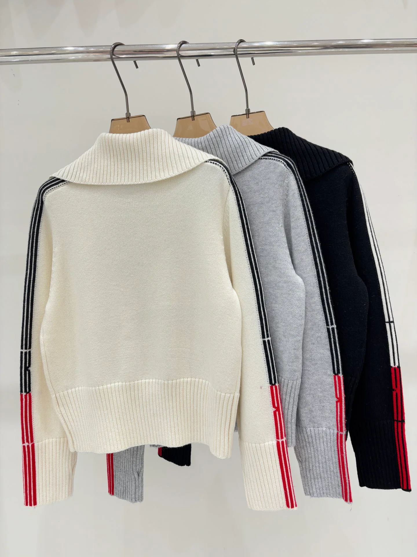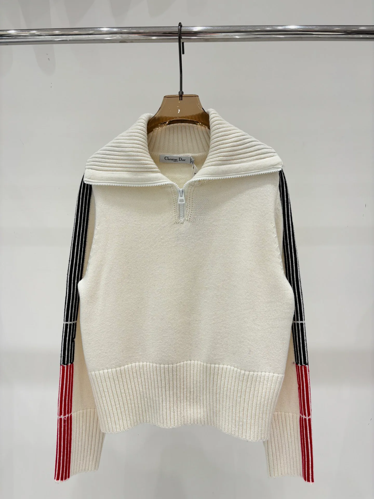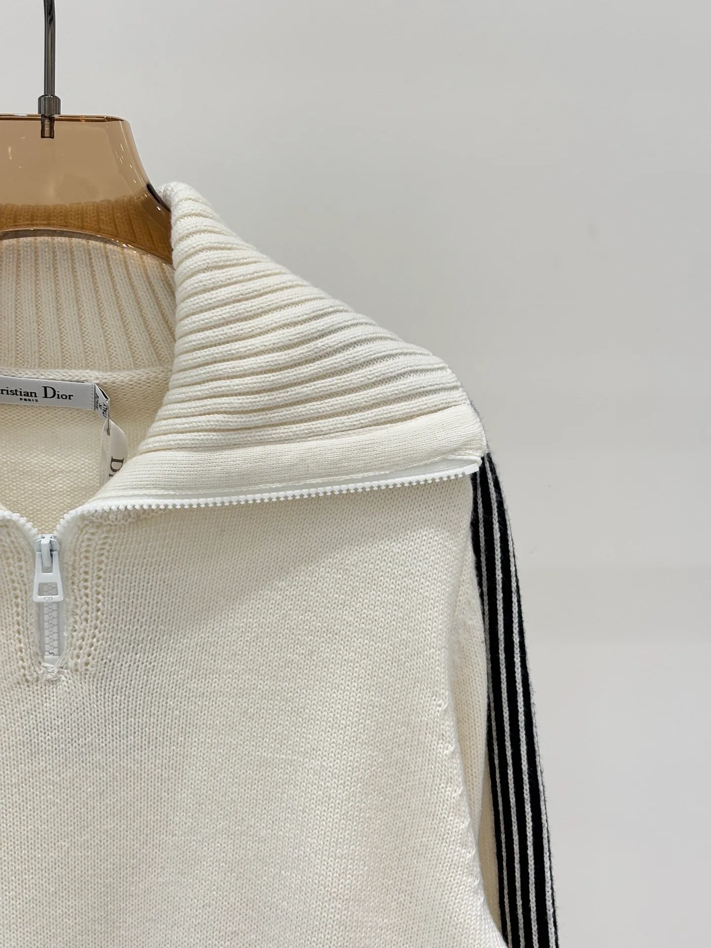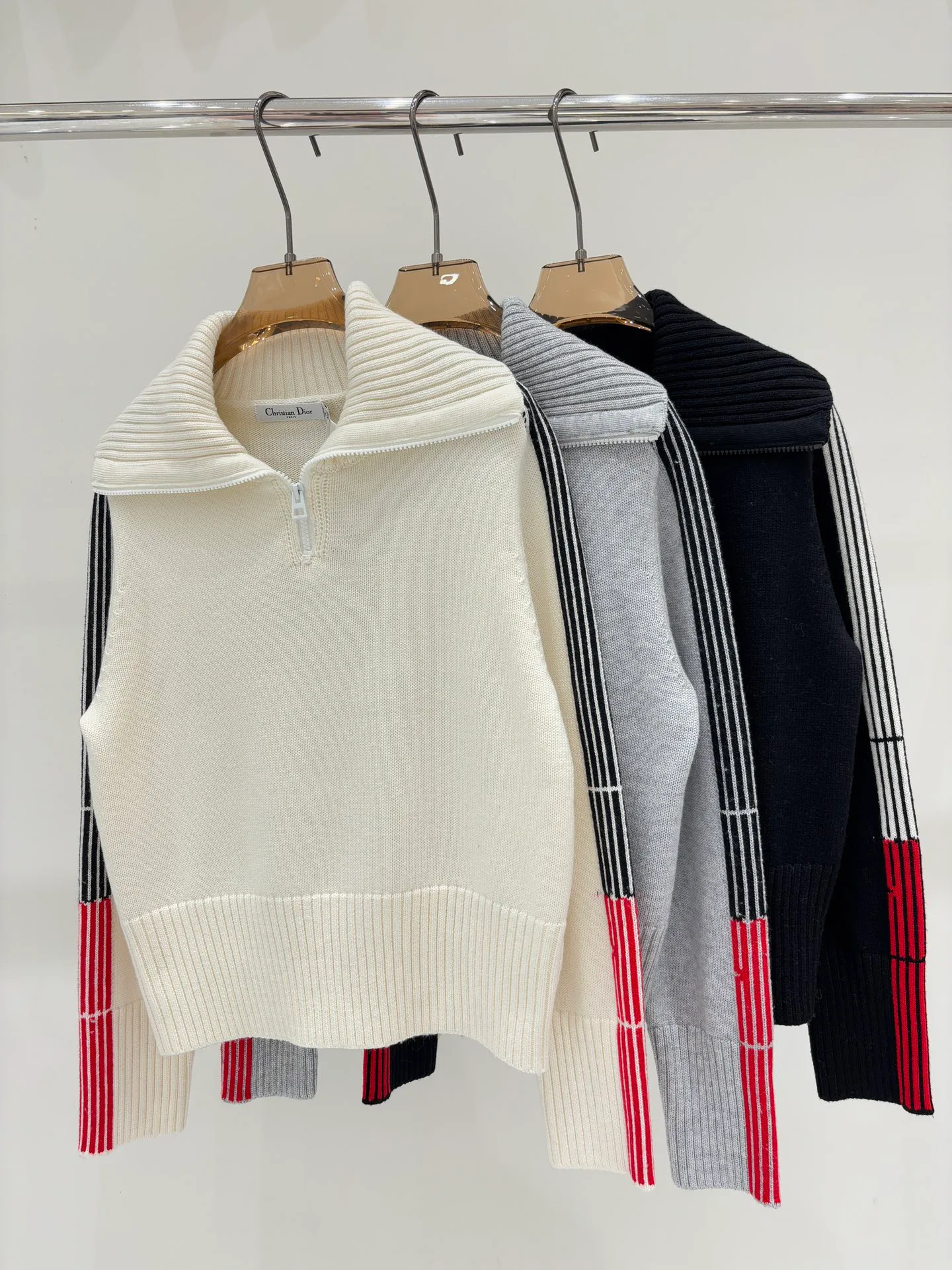 Основные характеристики: цвета белый, серый, черный. Размеры S, M, L. Воротник отложной. Застежка полузип на груди, удобная при надевании. Дизайн цветной контрастный блок в виде полос и полосатый нижний край. Силуэт свободный, крой регулярный, комфортный для повседневной носки. Материал вязанный трикотаж, мягкость и тепло, подходит для ранней осени. Уход бережная стирка по ярлыку, рекомендации по уходу зависят от состава ткани.