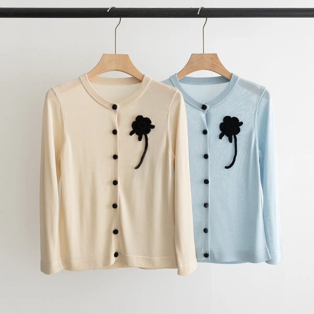 Декоративный ручной связанный цветок на левой стороне груди подчеркивает уникальность изделия. Пуговицы в виде цветов также связаны вручную. Кардиган доступен в двух цветовых вариантах и подходит для повседневного гардероба и особых случаев. Сочетается с джинсами и юбками, добавляя нежную нотку к образу.