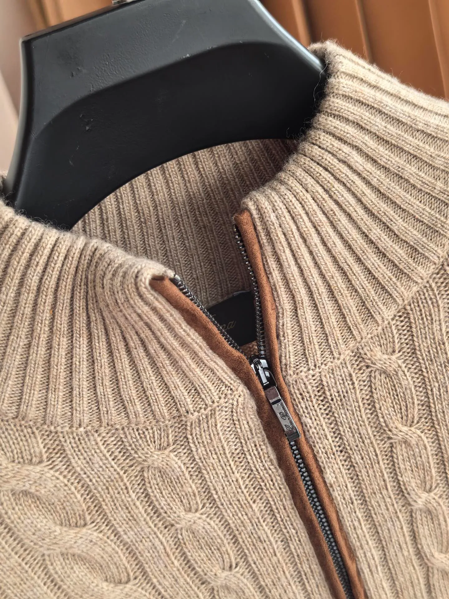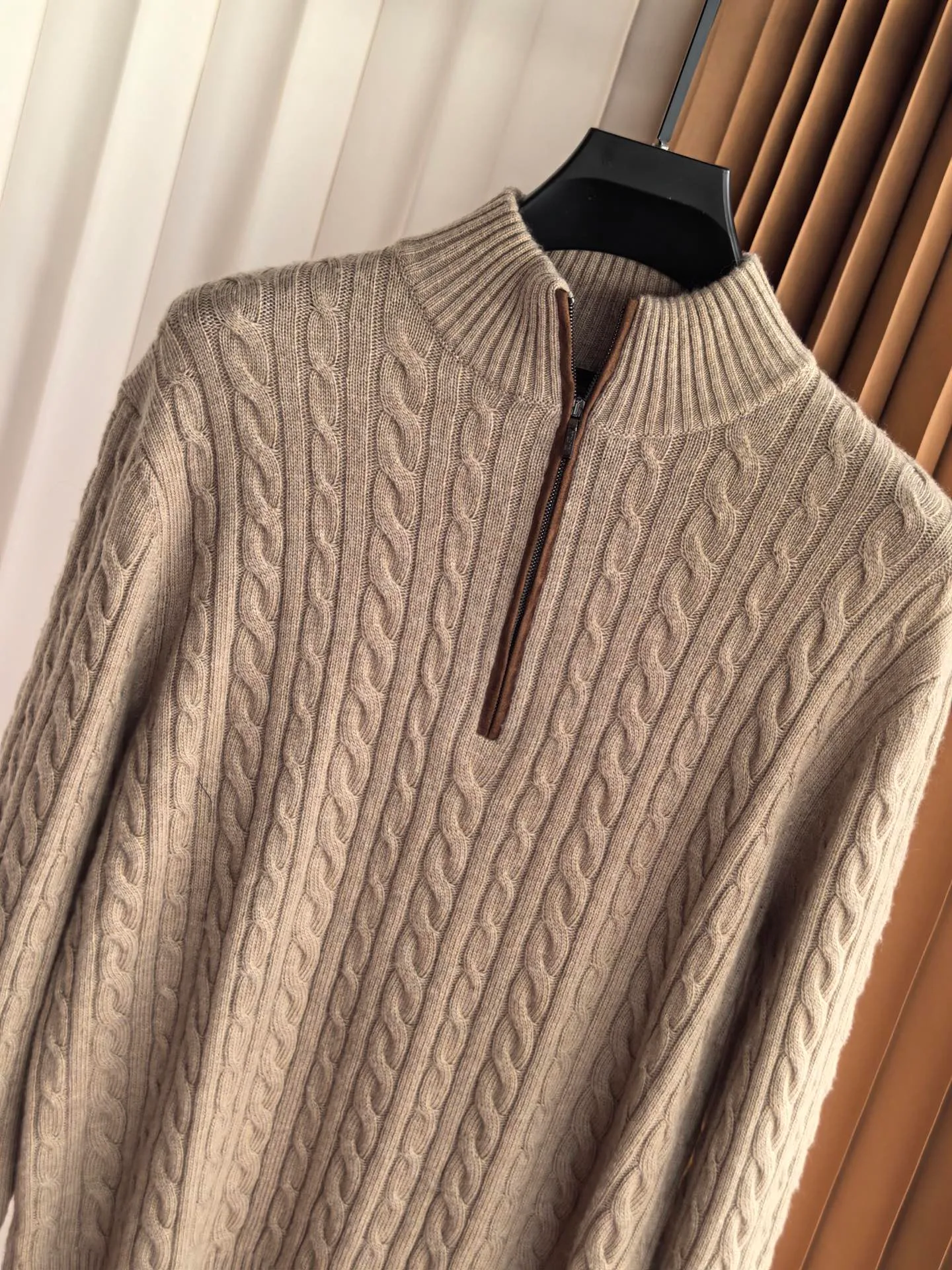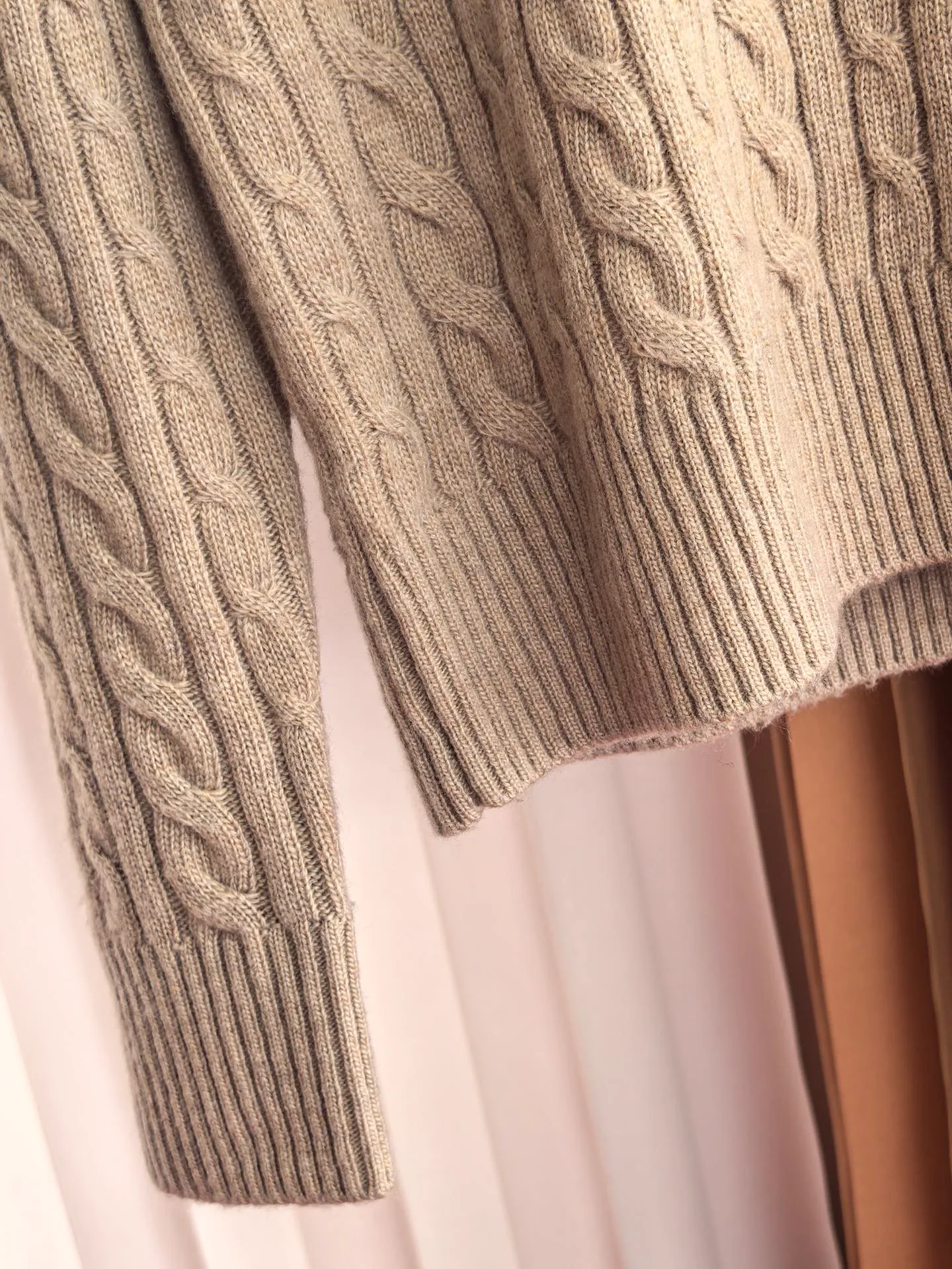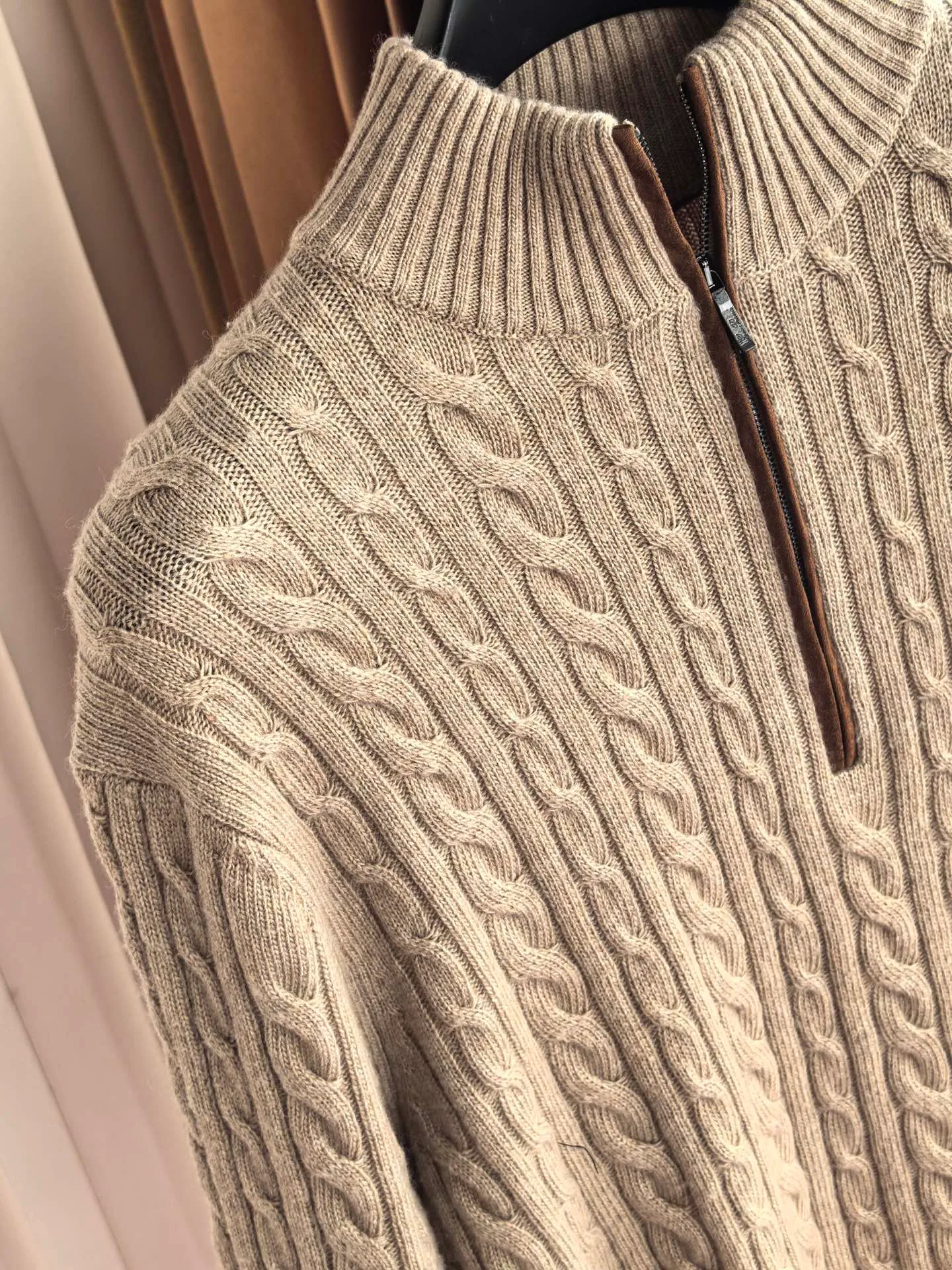 Изделие украшает особая хацкая вязка, создающая объем и рельеф. Фирменные металлические элементы подчеркивают внимание к деталям, а универсальный дизайн позволяет комбинировать свитер с джинсами или деловыми брюками. Доступен в размерах от M до 3XL.