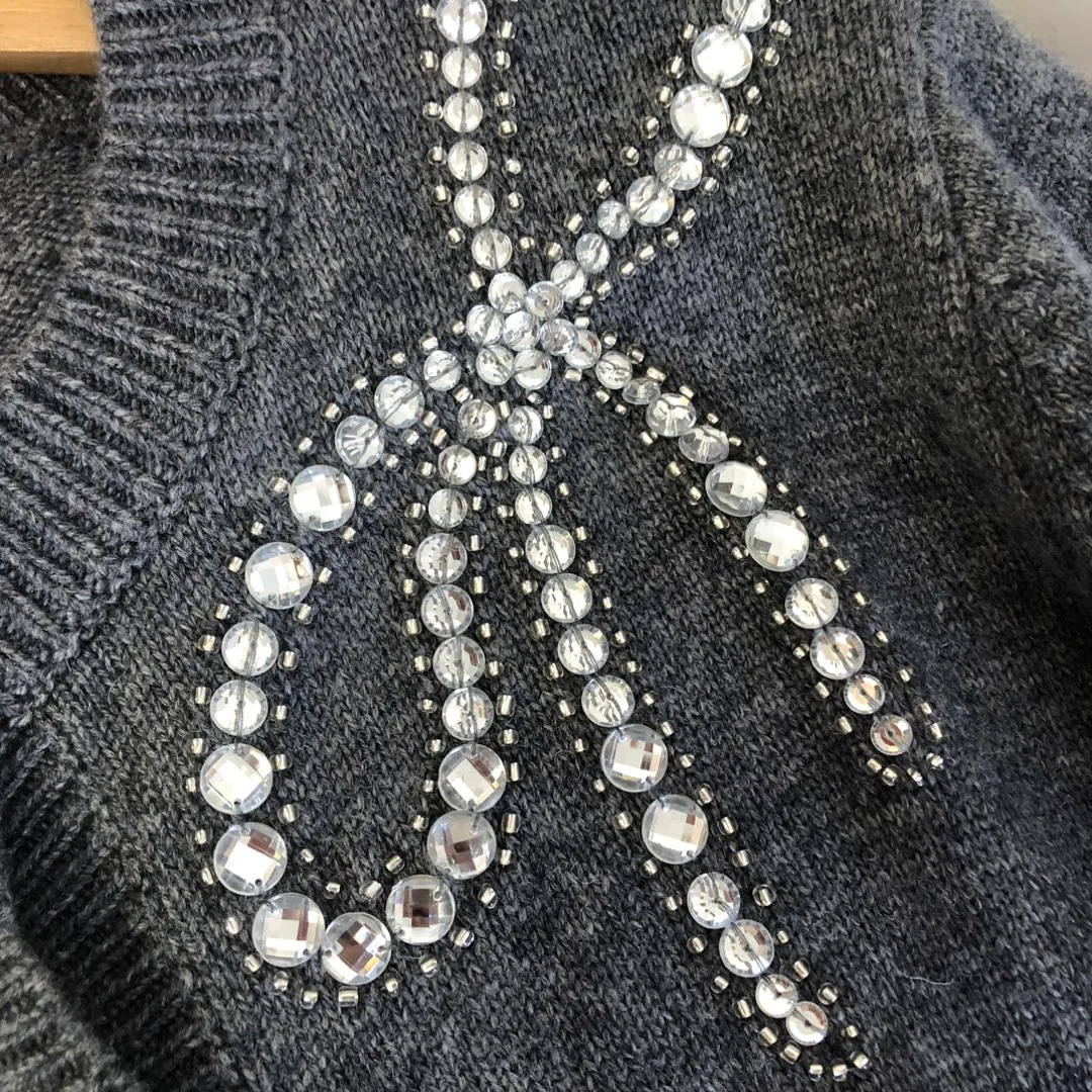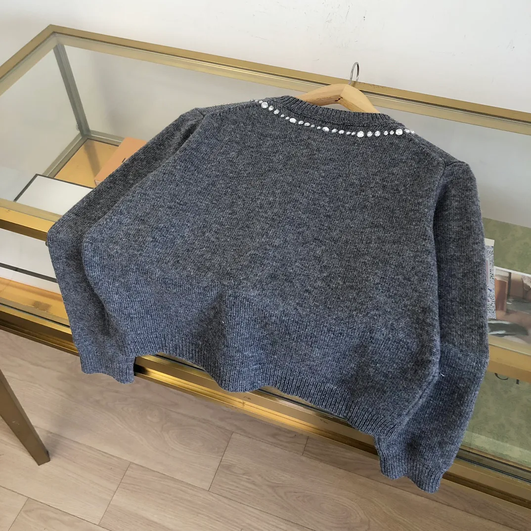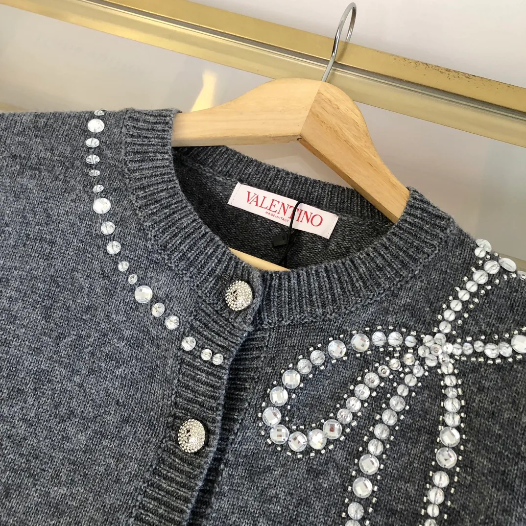 Кардиган подходит для холодного сезона и доступен в размерах S, M, L. Особенности дизайна включают ручную работу, а также пуговицы с логотипом и инкрустированными кристаллами. Два цветовых варианта — мягкий серый и глубокий чёрный — подчеркивают статус и благородство изделия.