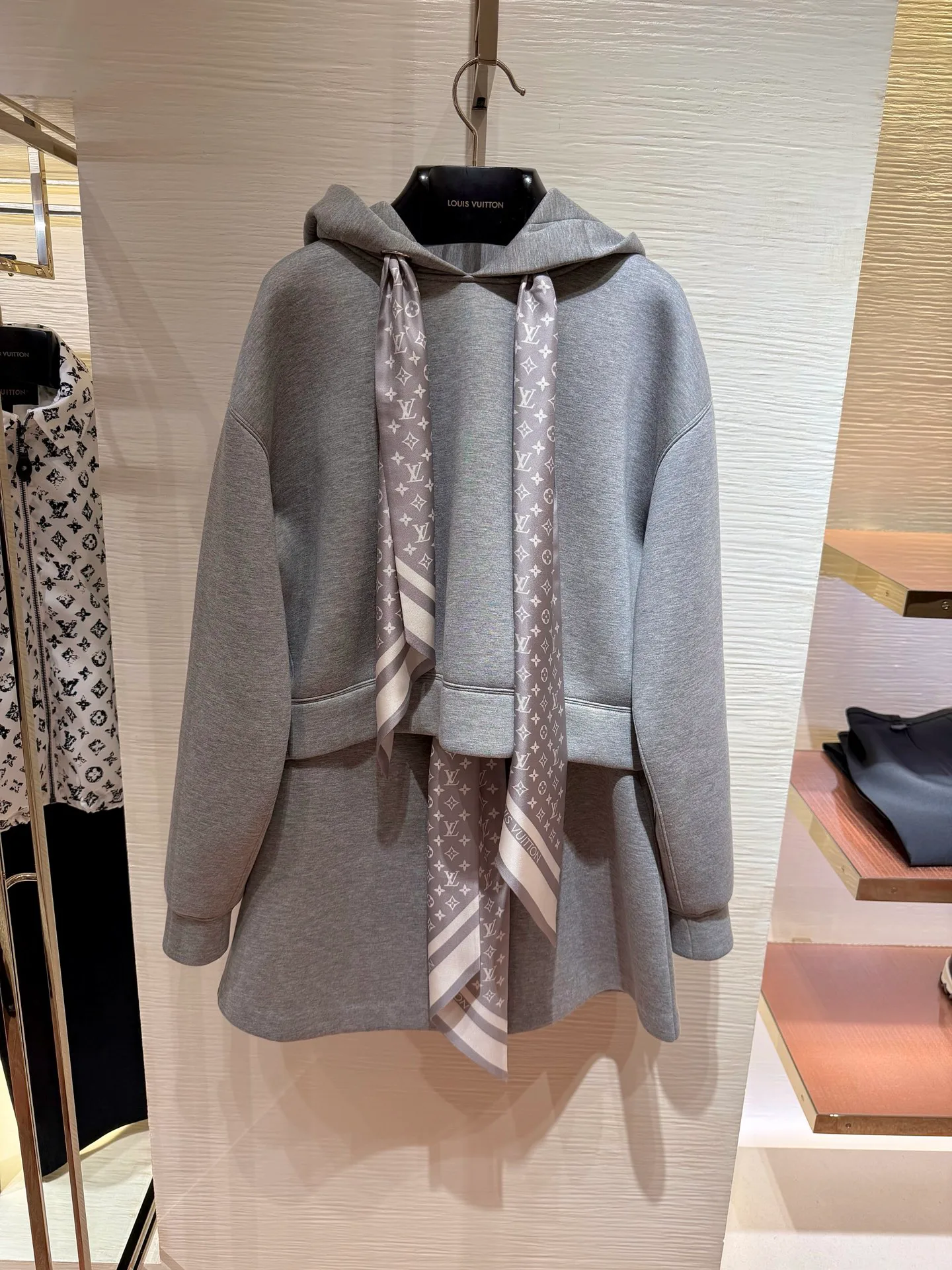 - Дизайн и детали: монограммы LV на худи и шарфе в сдержанном, но заметном исполнении.