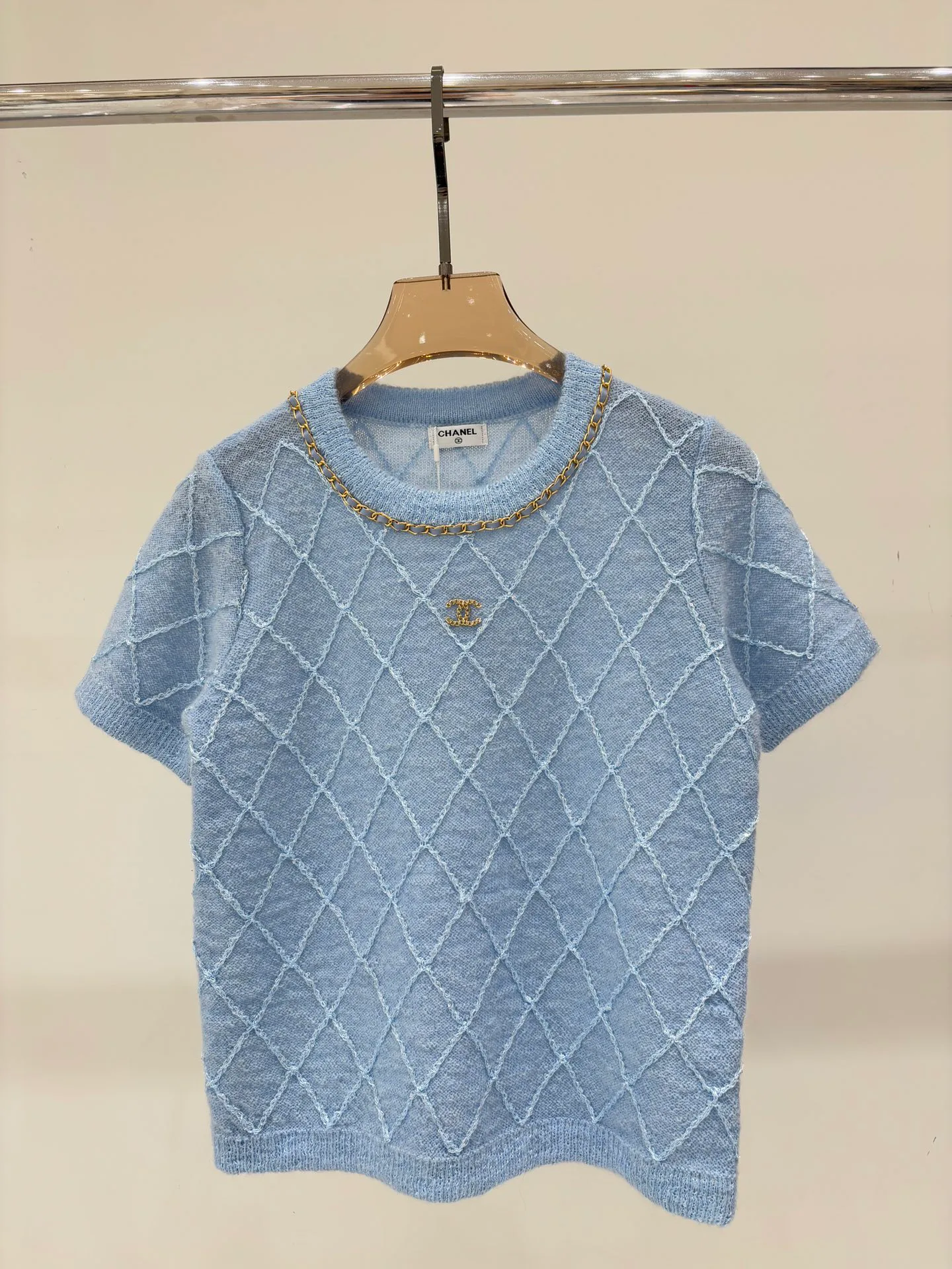 Топы женские CHANEL — осенне-зимняя эксклюзивная новинка с вязкой, выполненной с ромбовидной стёжкой и цепочной отделкой на круглом вырезе. Короткие рукава и лаконичный крой обеспечивают удобную посадку в прохладную погоду. Предлагается в трех цветах: белом, синем и черном. Доступны размеры S, M и L. Этот топ сочетает фактуру вязки и стильные детали, подходящие для городских образов в холодный сезон.