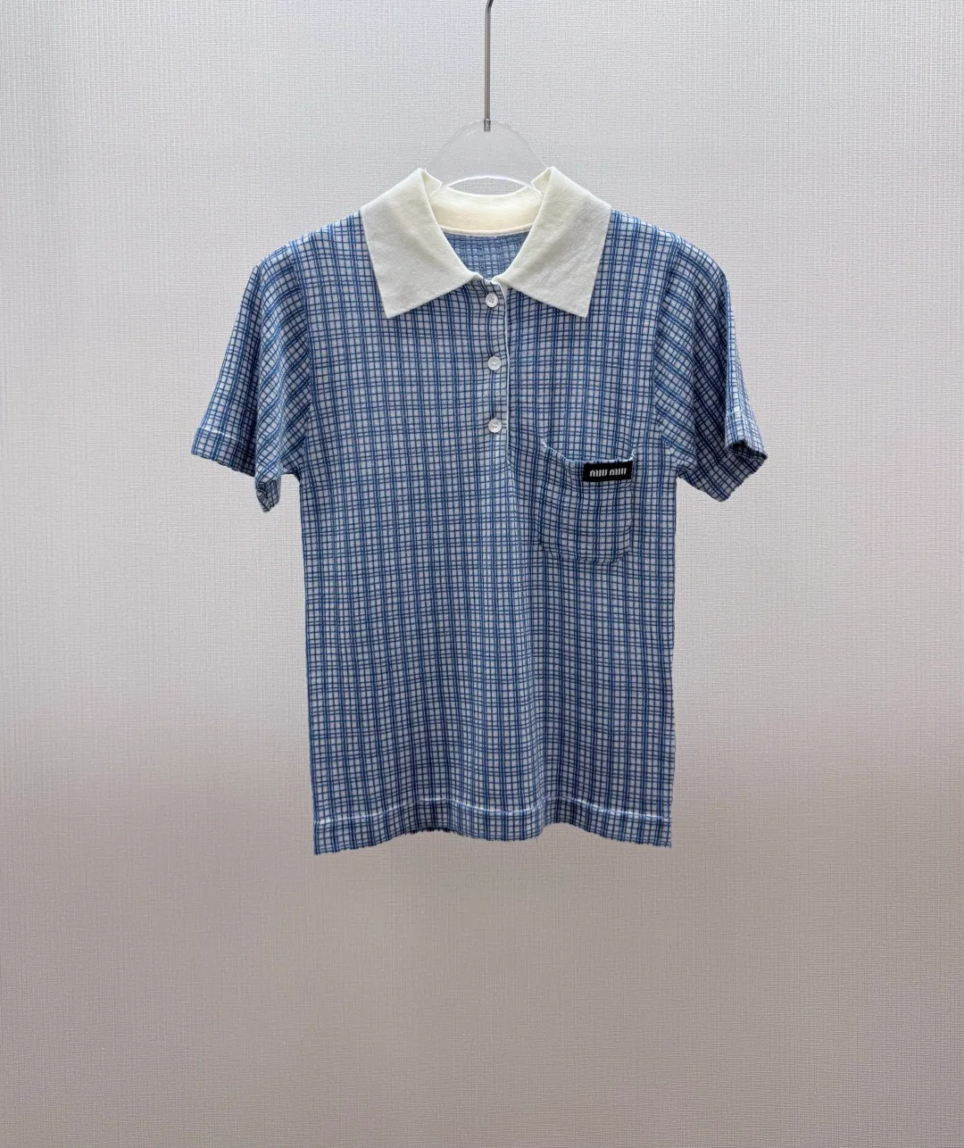 Топ женский MIU MIU — модель из ранней весенней коллекции с дизайном в стиле поло и отложным воротником. Изделие выполнено в сине-белой цветовой гамме с мелким клетчатым узором и декоративной жаккардовой нашивкой с логотипом. Материал представляет собой мягкую и эластичную пряжу из смеси кашемира и шелка, которая приятна к телу. Классический фасон рассчитан на долгое время ношения.