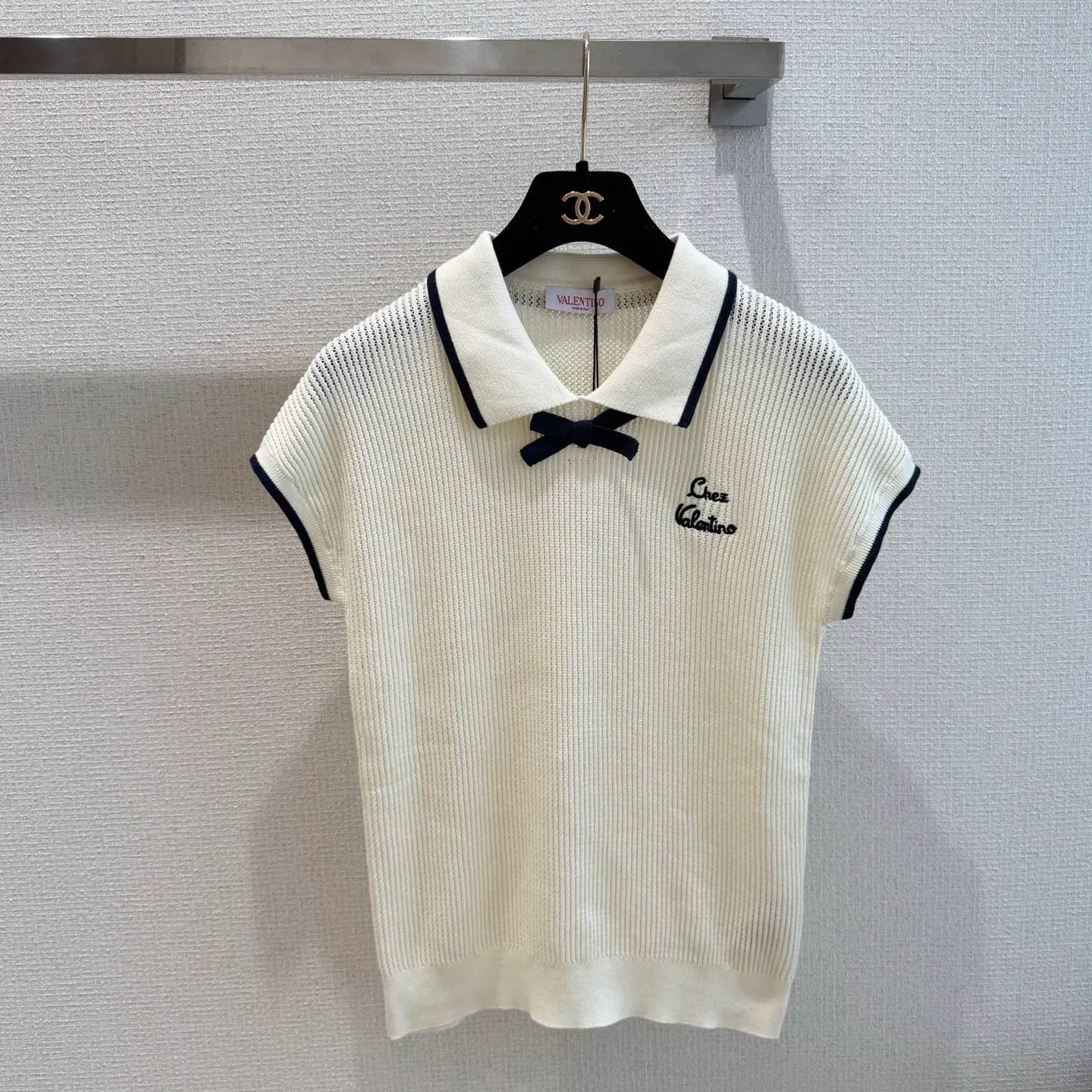 Топы женские VALENTINO — новая модель в стиле преппи из коллекции 26ss, выполненная из дышащей и комфортной вафельной ткани молочного оттенка. Модель имеет короткий рукав, отложной воротник поло и контрастный бант, что создаёт элегантный и молодёжный образ. На груди расположена фирменная вышивка, подчёркивающая детализацию. Эта вещь подходит для повседневной носки и учёбы, обеспечивая ощущение свежести в летний сезон.