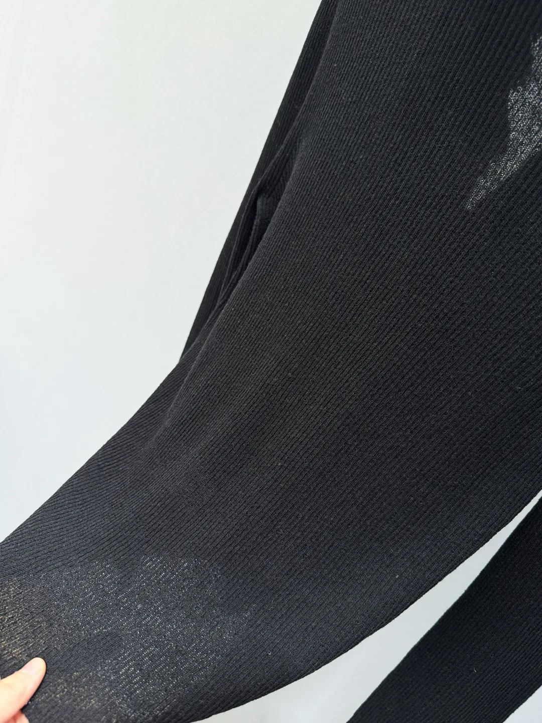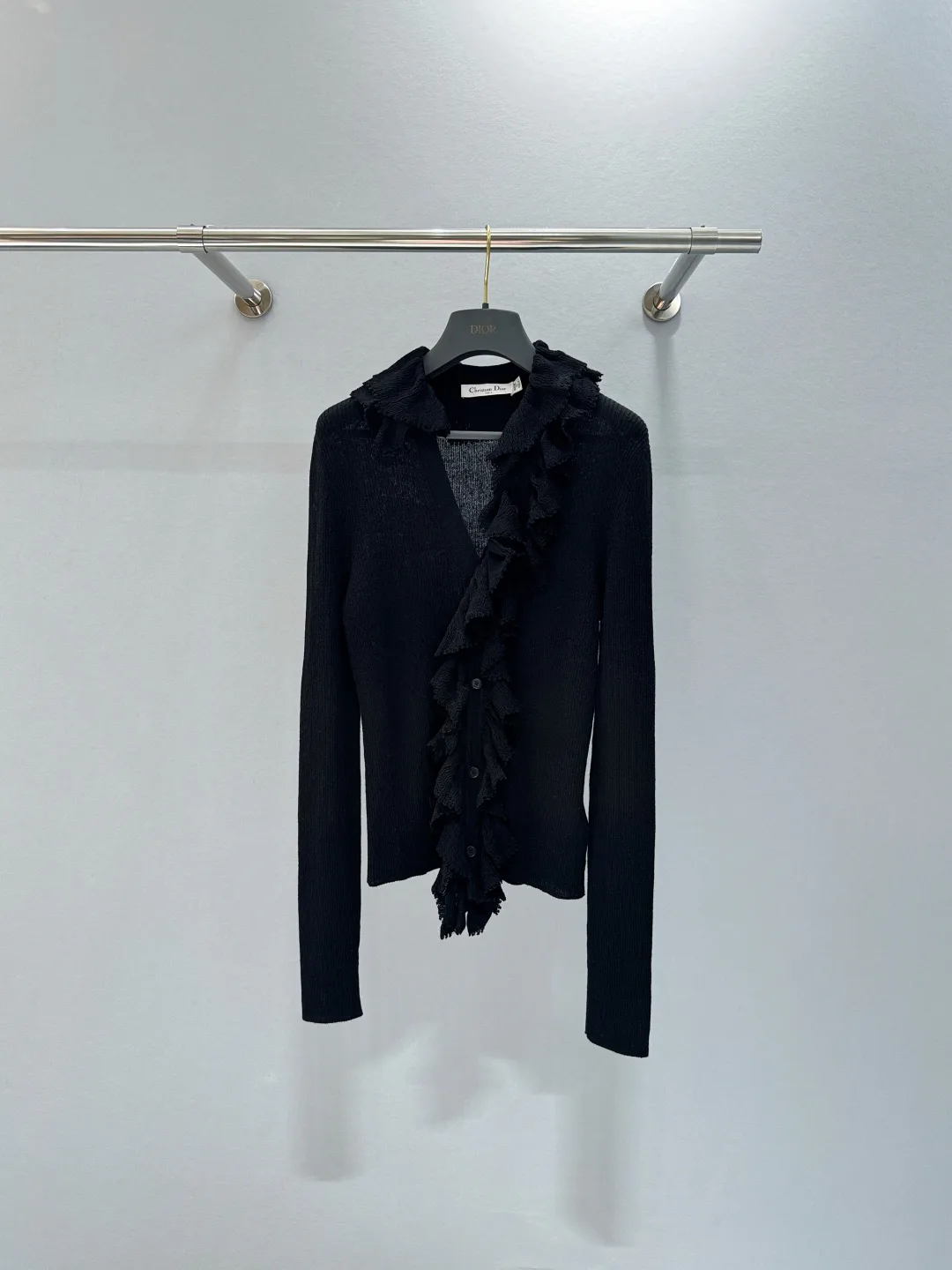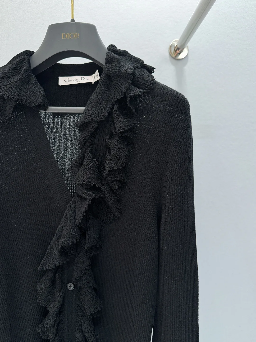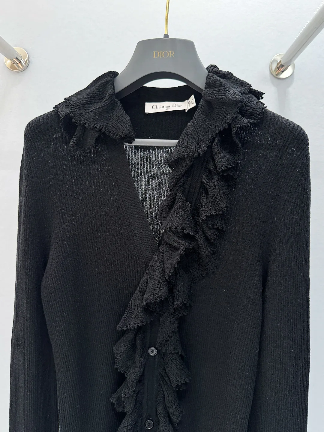 Кофта имеет переднюю планку с натуральными пуговицами из перламутра, которые добавляют функциональности и декоративности. Двойные рюши на нижнем крае создают мягкую посадку и придают образу нежности. Доступна в черном и бежево-песочном цветах, оба варианта легко интегрируются в разные стили гардероба. Размеры 36, 38, 40.