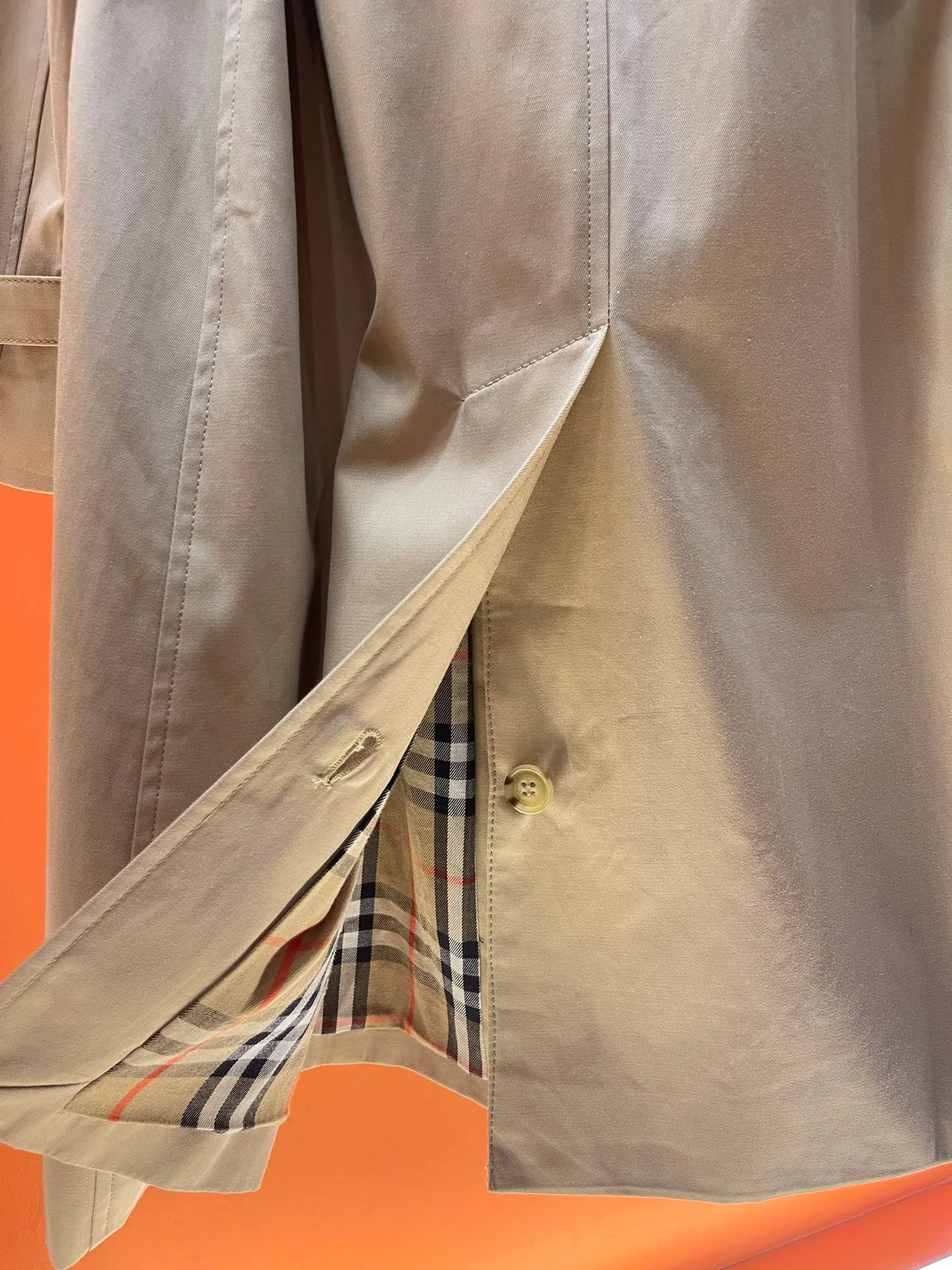 Это универсальное изделие подходит как для повседневной, так и для деловой одежды. Тренч сшит вручную мастерами в Йоркшире, Англия, что подтверждает высокое качество исполнения. Доступные цвета — хаки и королевский синий, размеры варьируются от 4 до 12.
