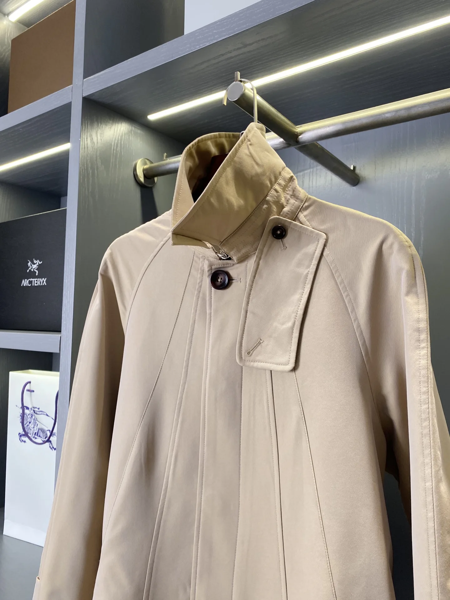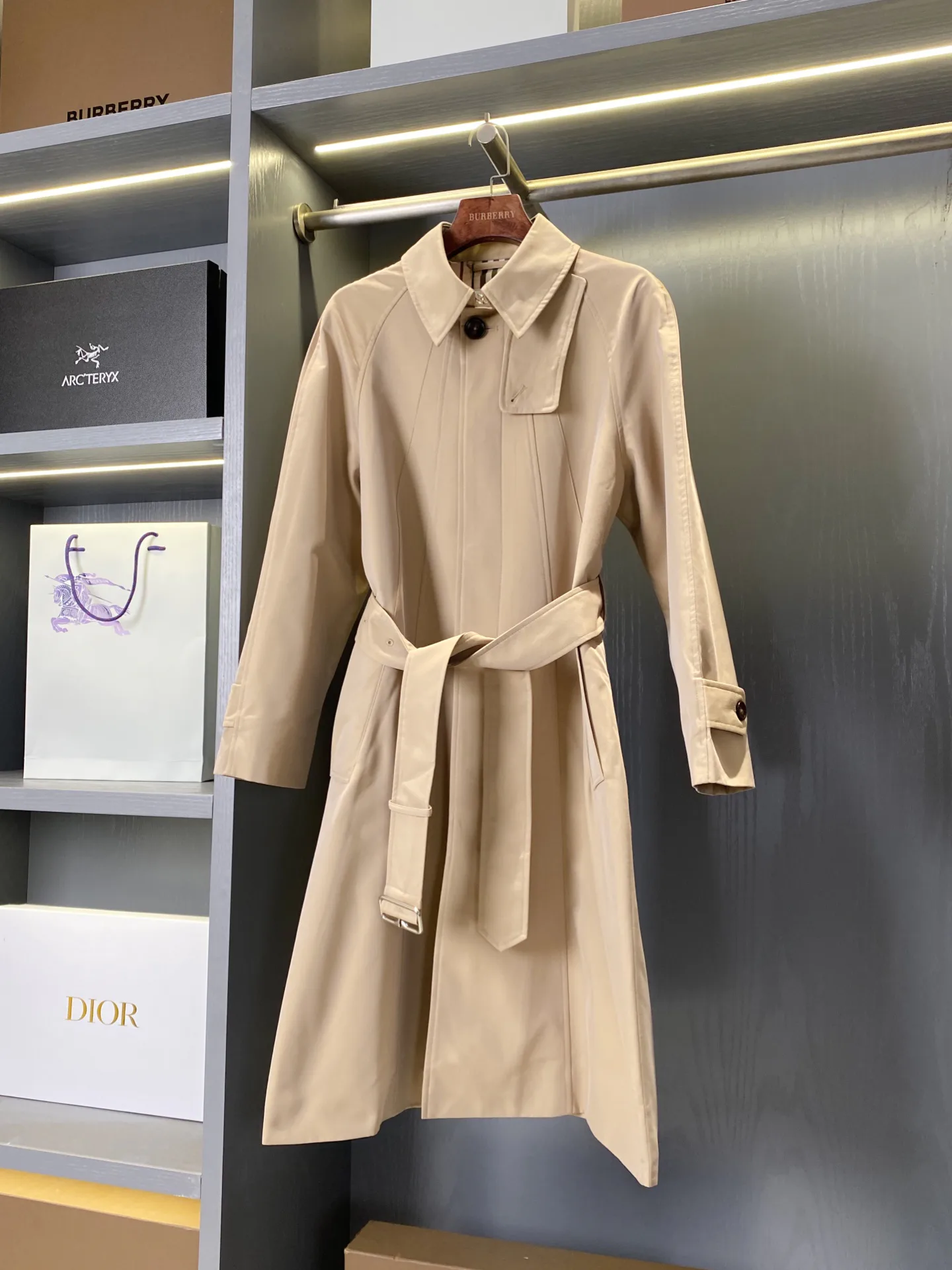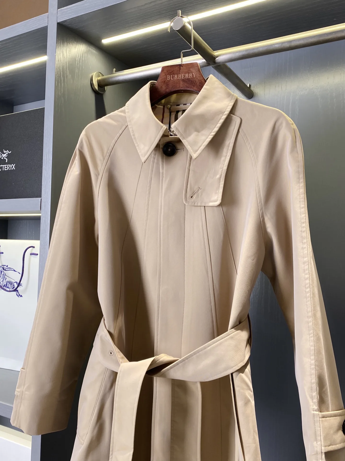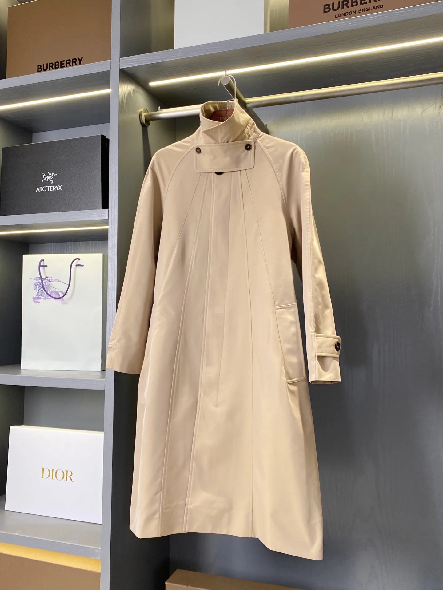 Пальто имеет прямой крой, точную подгонку под фигуру и пряжку в форме буквы B. Застёжка спереди и глухие декоративные хуки на воротнике обеспечивают надежность в ветреную погоду. Обломок дизайна позволяет носить пальто как расстёгнутым, так и застёгнутым. Размерная линейка включает UK4–UK12.