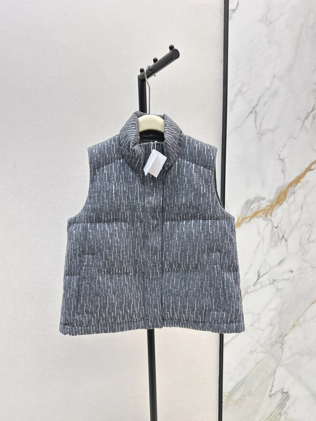 Жилет женский BRUNELLO CUCINELLI — осенне-зимняя роскошная минималистичная жилет-куртка с высоким воротником. Особое внимание уделено деталям: крупная вышивка и кристалло-стразы BlIng придают образу нотку роскоши. Внешний слой выполнен из 100% шерсти, внутреннее наполнение — белый гусиный пух около 90%. Крой в форме H обеспечивает комфортную посадку и свободу движений, посадка не давит по фигуре и подходит практически всем фигурам. Доступны две цветовые вариации и размеры S, M, L. Уход за изделием следует инструкциям производителя по шерсти и пуху.