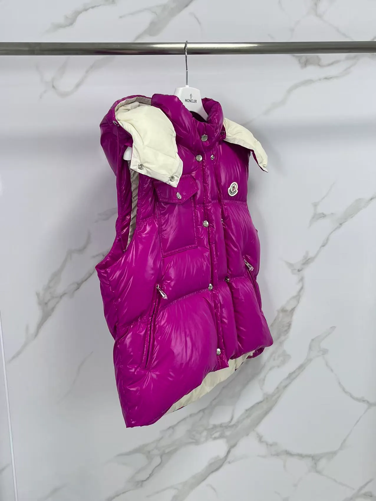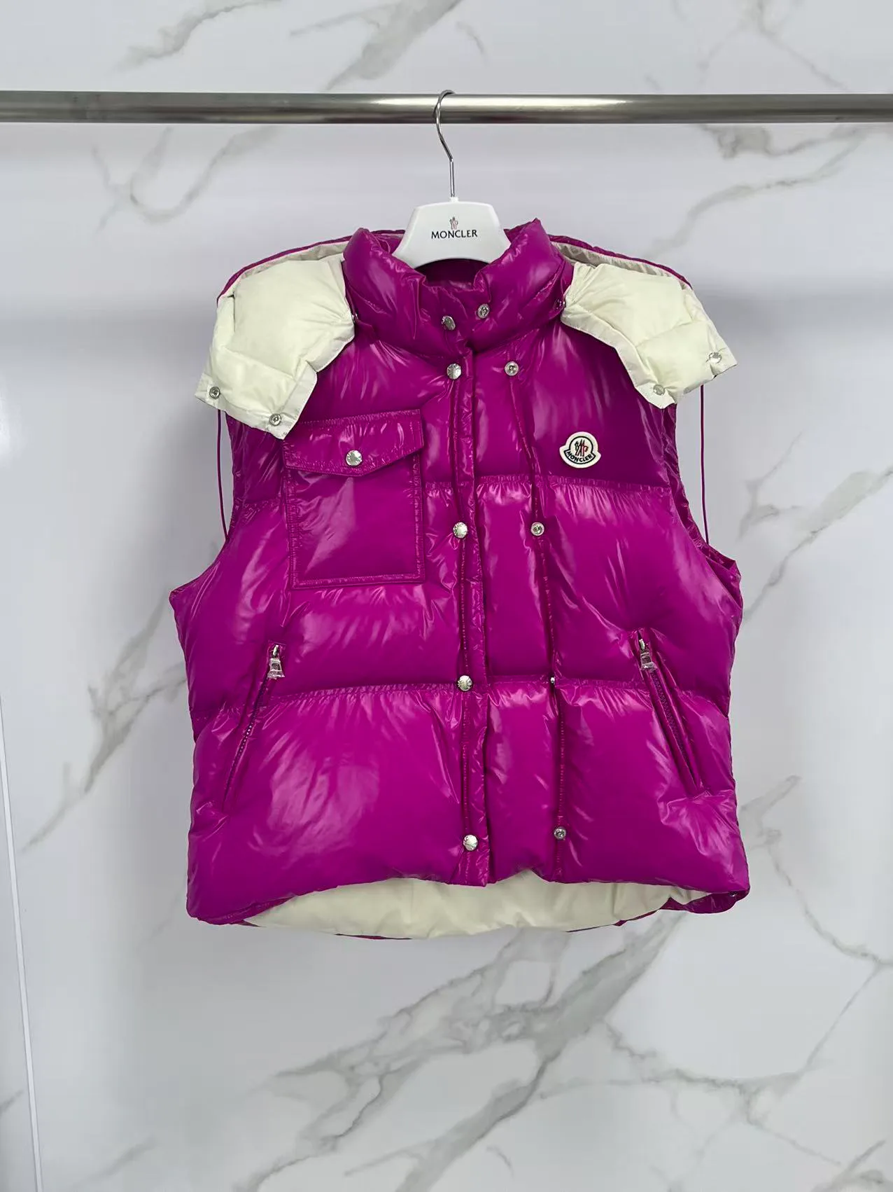 Асимметричный дизайн и стежка различного размера создают динамичный образ. Жилет представлен в розово-малиновом, черном и белом цветах. Лучше всего носить его в городских условиях осенне-зимнего сезона, сочетается с водолазками, пальто и повседневными куртками.