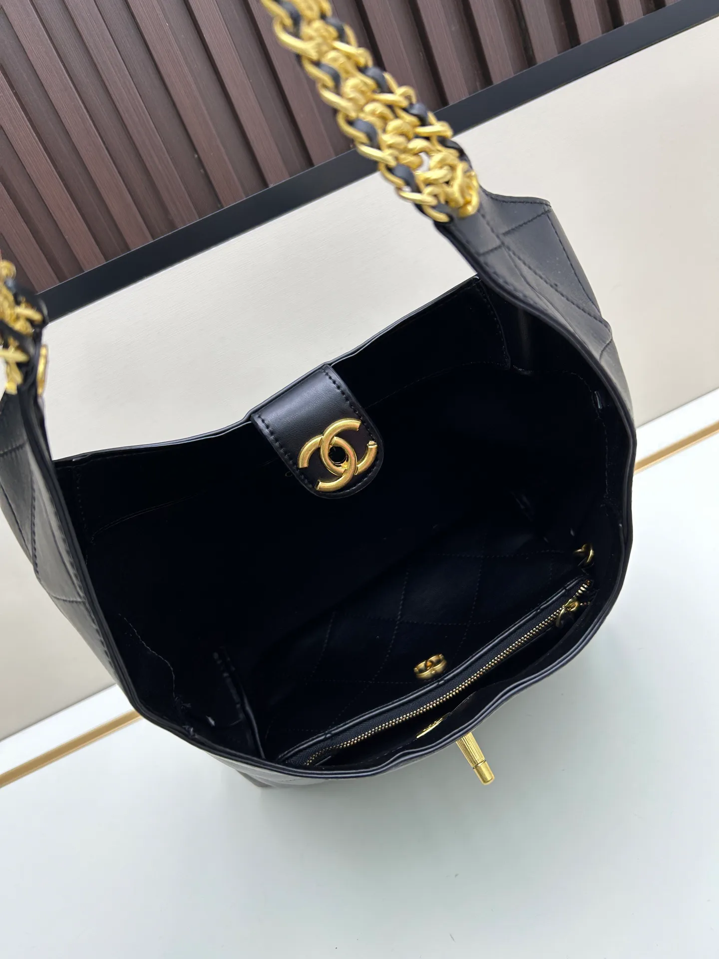 Сумка оформлена в духе хиппи, с акцентом на мелкие детали и аккуратную отделку. Центральная цепь украшена классической ромбовидной стежкой, характерной для CHANEL. Общий вид подчеркивает роскошь и утонченность, а продуманная геометрия делает модель заметной в коллекции.