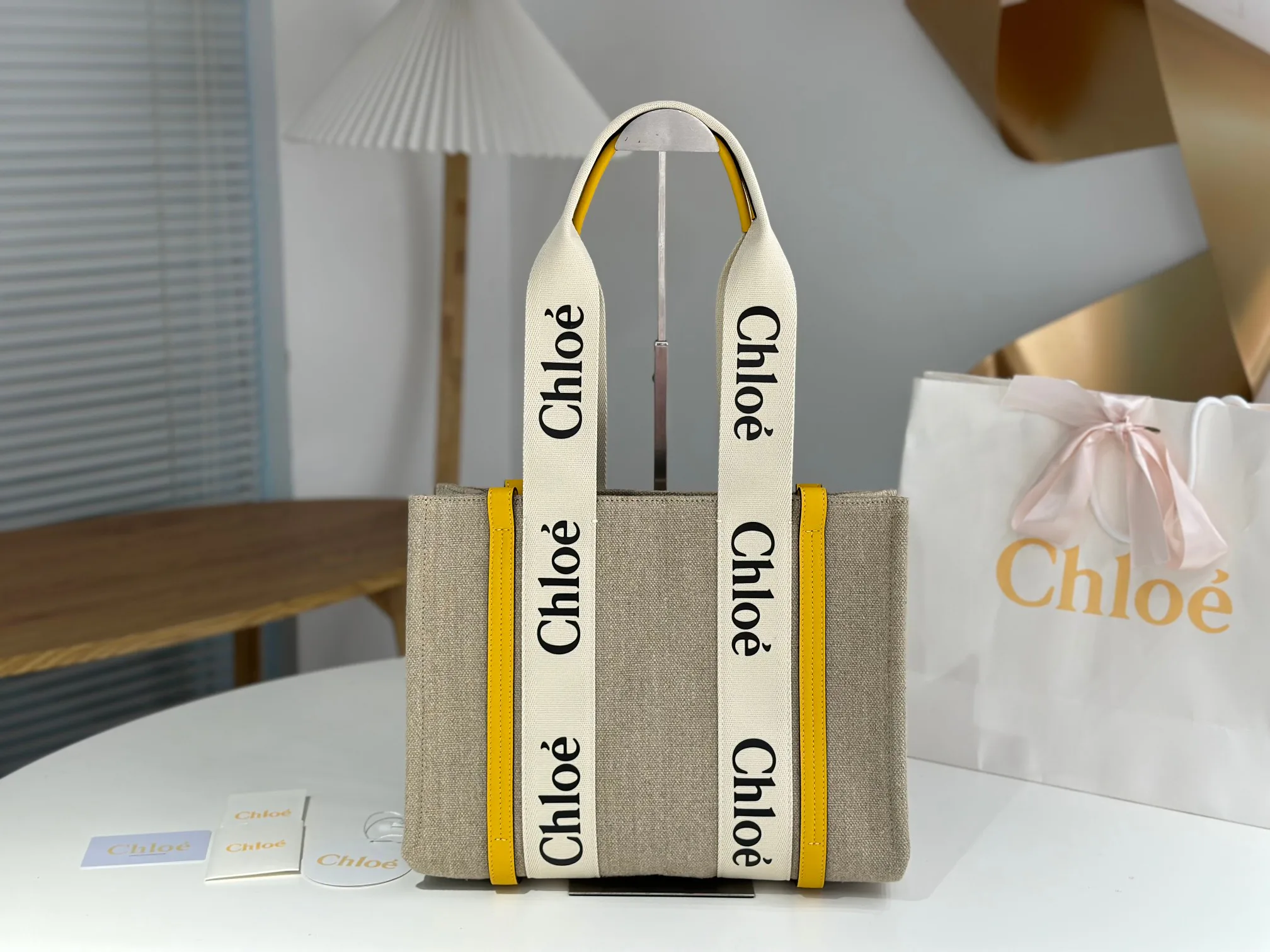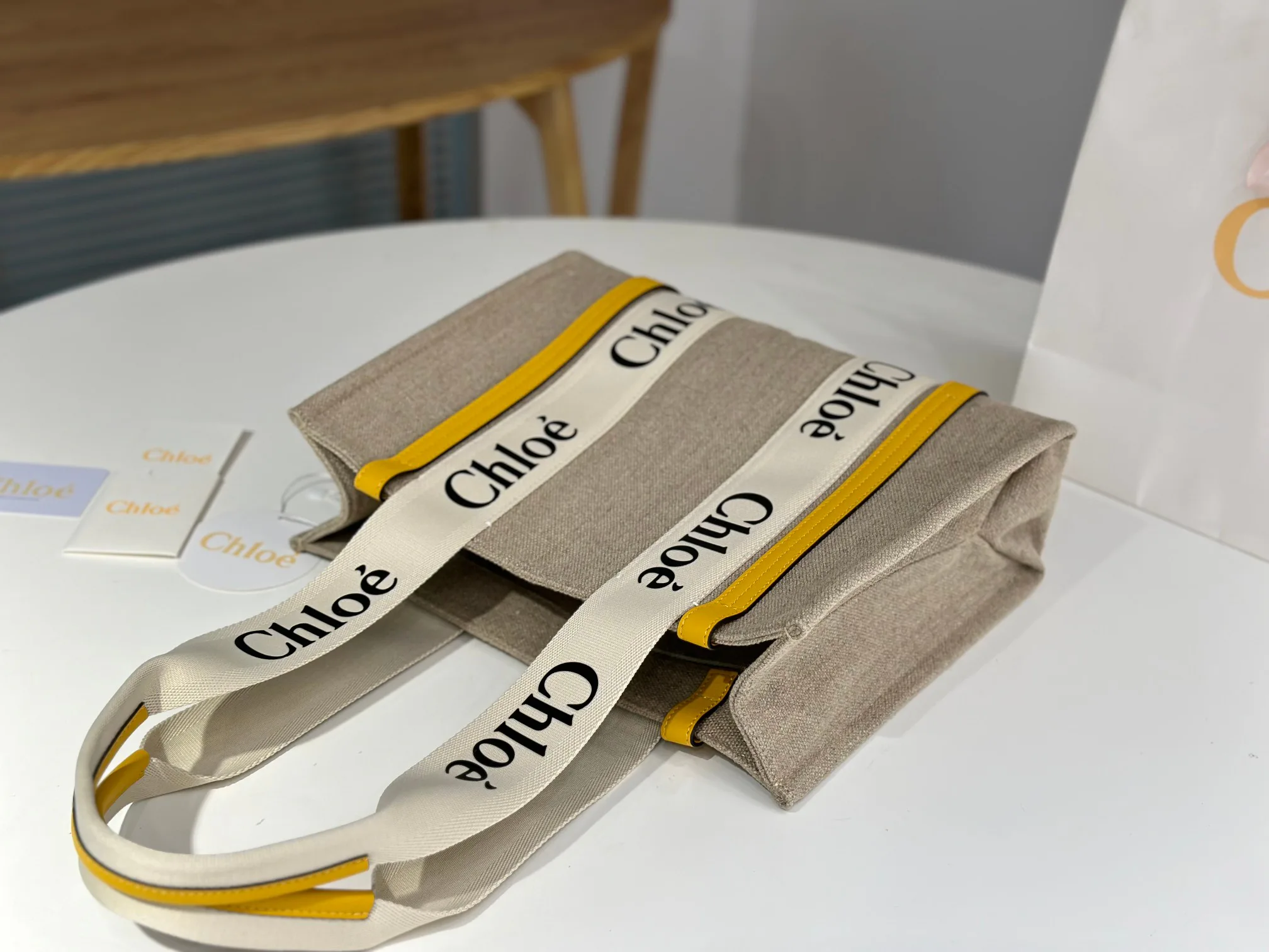 По всей поверхности сумки проходит белая лента с шрифтом Chloe, создавая единый визуальный рисунок. Контрастная бежевая лента усиливает эффект черно‑белого лого на ремне. Сумка обладает чистым и элегантным стилем, подчеркивающим французскую эстетику повседневной роскоши.