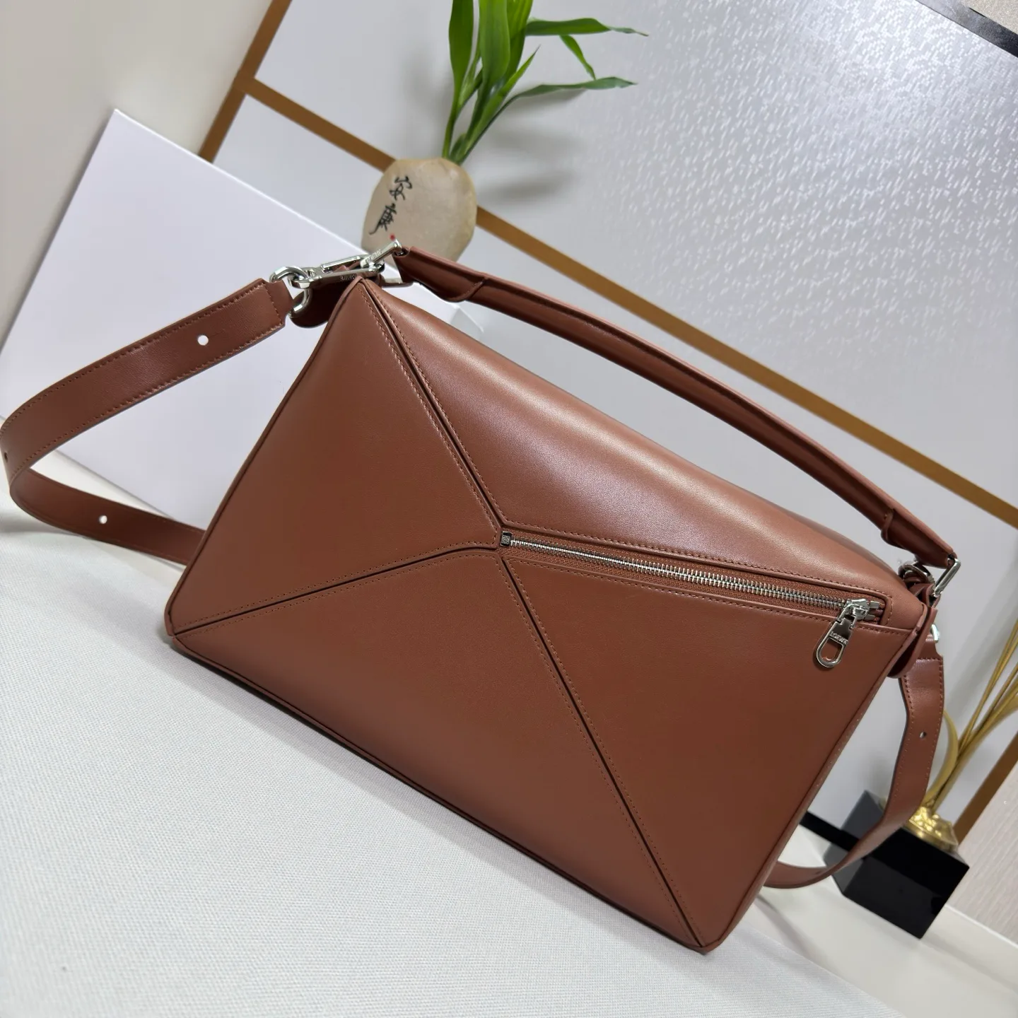 Детали включают съемный логотип LOEWE с тиснением, скрытый карман и декоративные металлические ножки, защищающие дно. Внутренняя отделка — напа кожа с тиснением Anagram и гравировкой логотипа LOEWE.