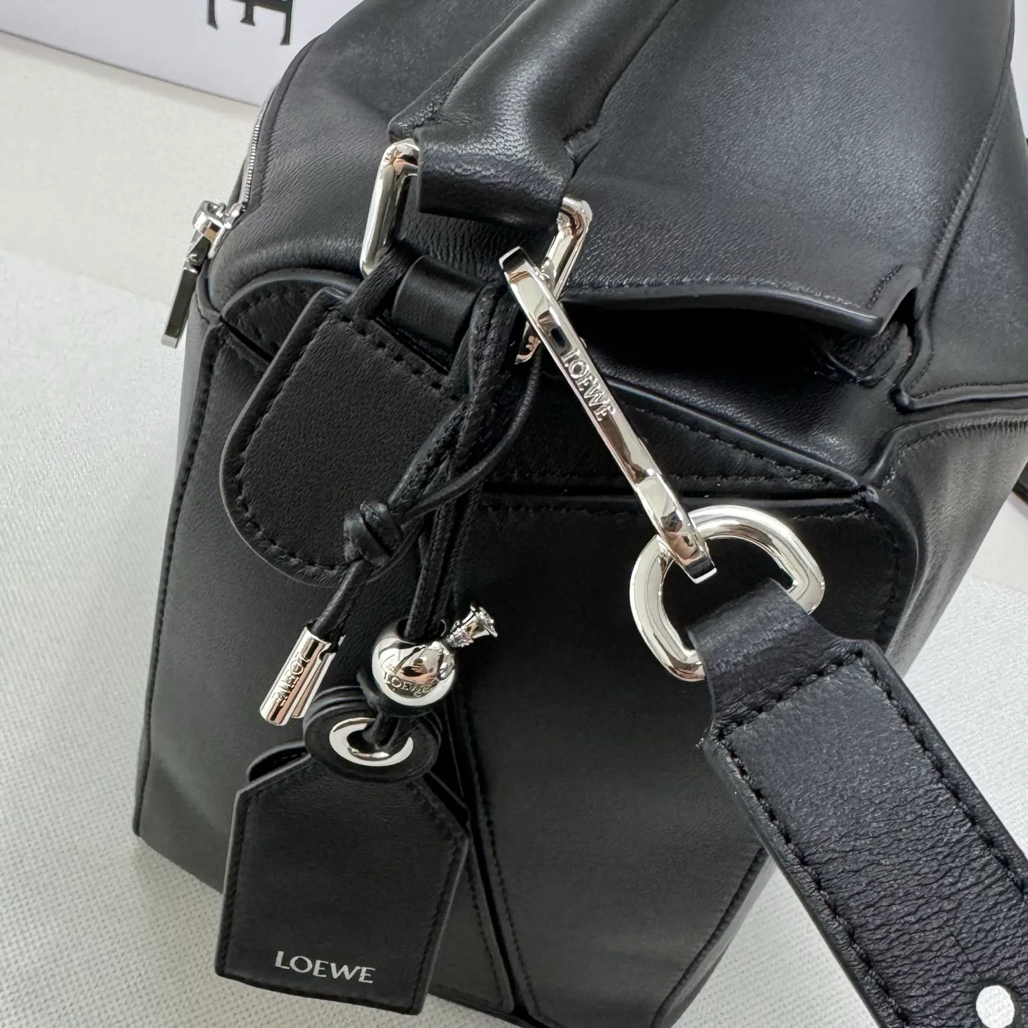 Форма изделия обеспечивает три варианта носки: на плече, через плечо или как ручная. Сумка оснащена съёмным регулируемым плечевым ремнем с вращающейся пряжкой и молнией по всей длине для удобного доступа. Внутри находятся два накладных кармана, а также задний карман на молнии для мелочей. Подкладка также выполнена из Napa кожи, а декоративные элементы и тиснение Anagram подчеркивают стиль бренда LOEWE.