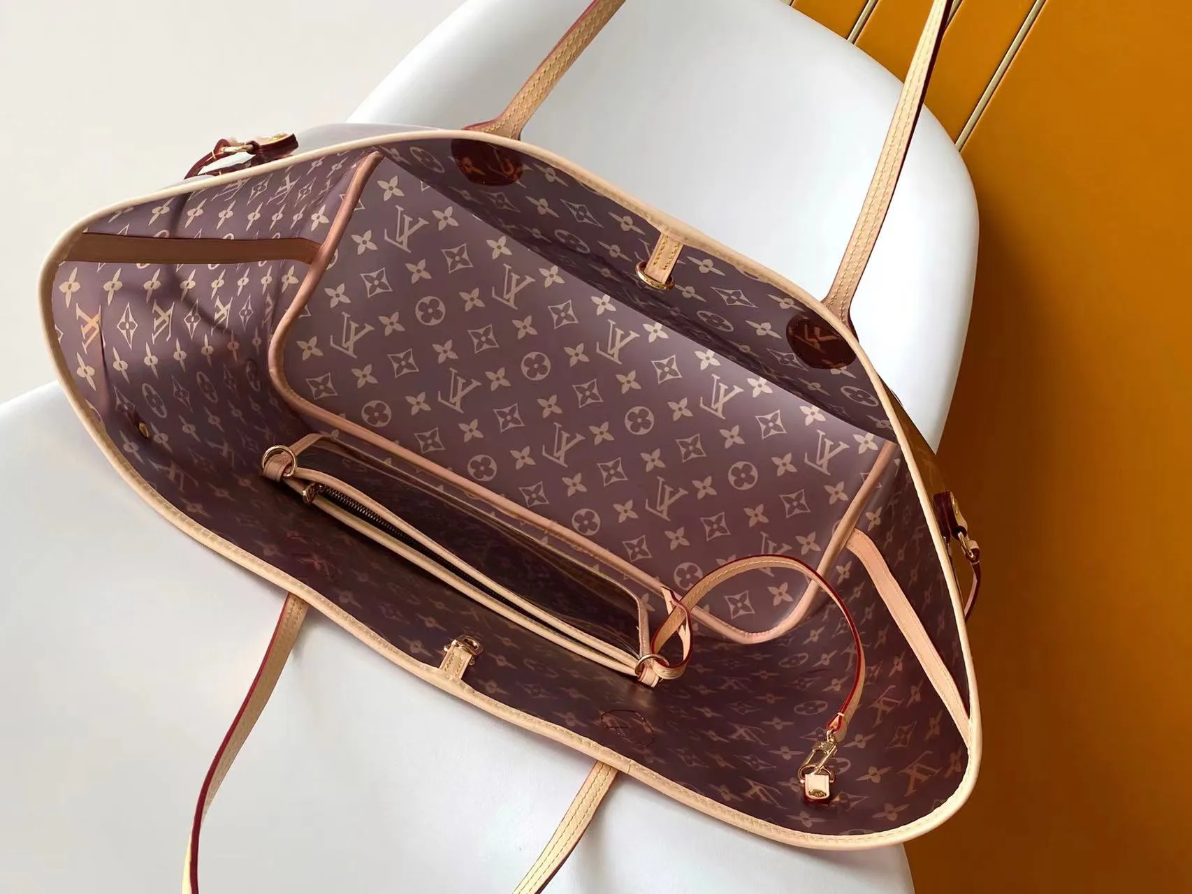 Сумка оснащена двумя боковыми ремнями, позволяющими менять форму: затянуть их для более компактного силуэта или распустить для увеличения объёма. Тонкие ручки обеспечивают удобство ношения на плече или в руке, а съемный карман может служить как отдельное портмоне, так и дополнительный карман внутри сумки.