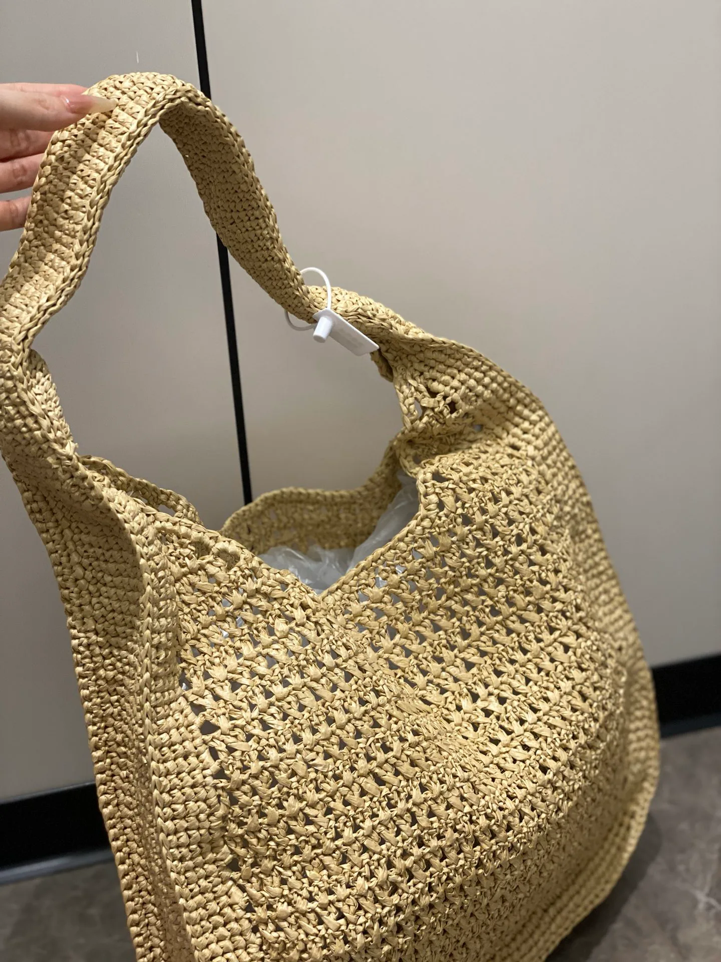 Размеры сумки составляют 40 × 33 × 9 см с горловиной 36 см. Легкий и прочный материал — натуральная рафия — гарантирует долговечность. Сумка прекрасно дополнит трикотажные и летние образы, а также отлично будет смотреться в сочетании с джинсами или пляжной одеждой.