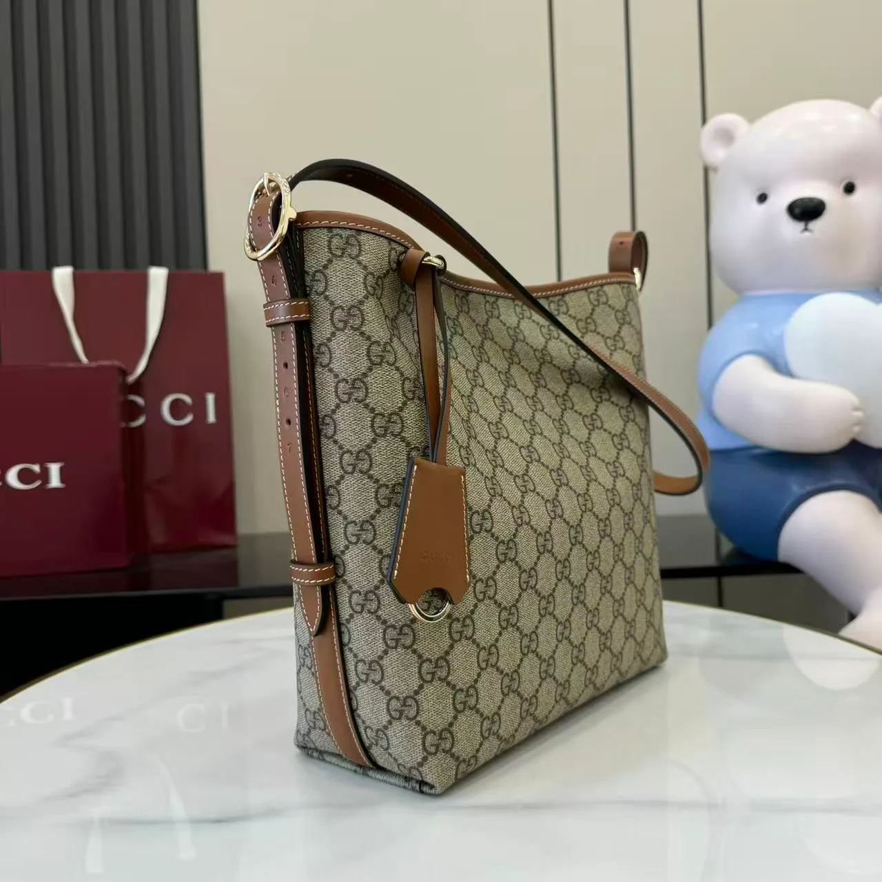 Классические сумки женские GUCCI — плечевая сумка из коллекции GG Emblem, подходящая для повседневного использования. Изготовлена из ткани с узором переплетённых букв GG и кожаной окантовкой по краям. Внутри имеется карман на молнии, подкладка хлопковая. Кожаный плечевой ремень регулируется: высота 30–47 см, длина 115 см. Застёжка — молния. Размеры — 24 × 26 × 10 см. Вес — около 0,55 кг. Цвет — кофейно-коричневый с отделкой ПВХ. Итальянское создание.