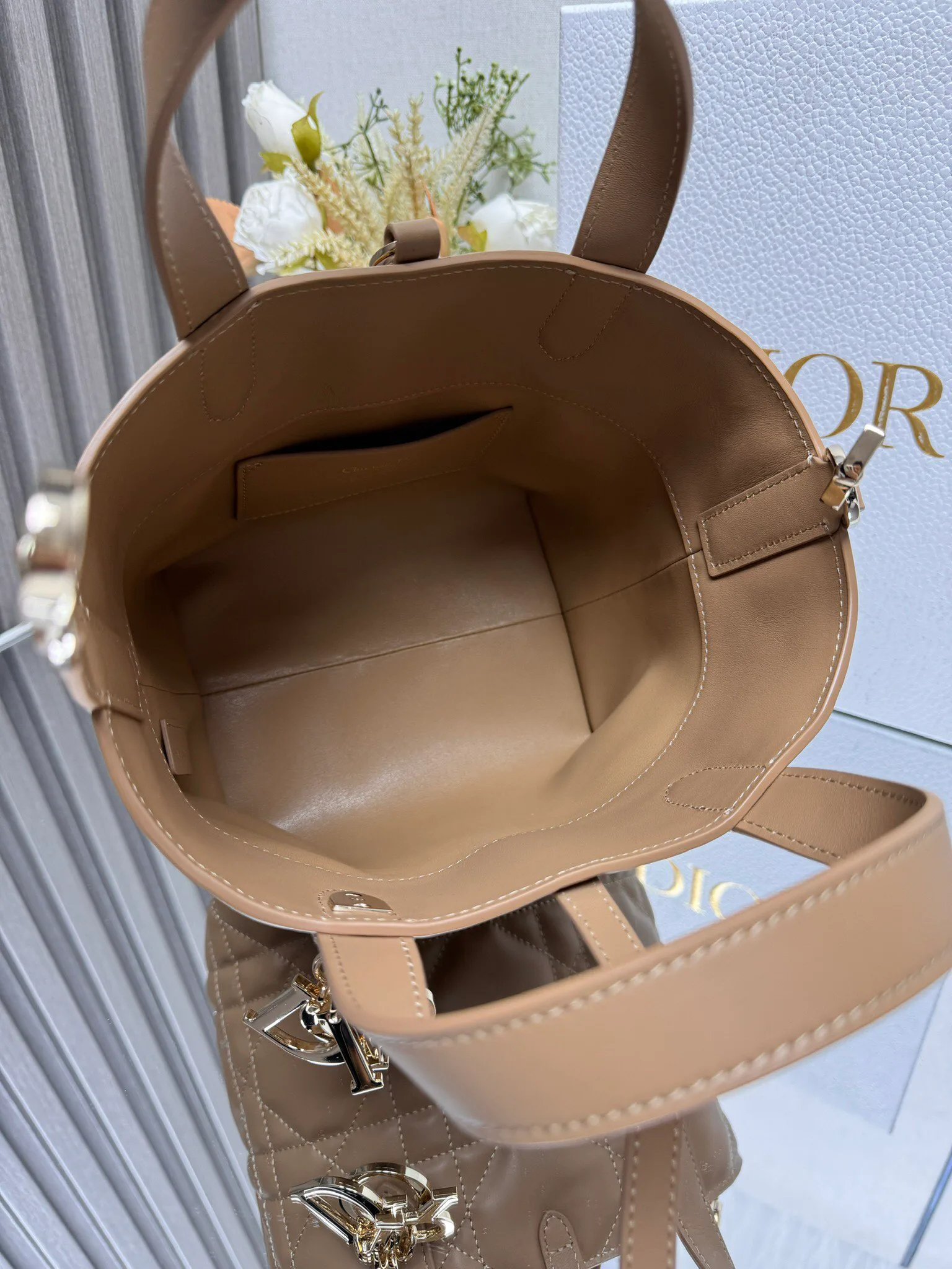 Внутреннее пространство сумки идеально подходит для хранения различных повседневных вещей, а также других необходимых мелочей. Сумка закрывается с помощью изящного кожаного шнурка, который обеспечивает надежную защиту вашего имущества. Дополняет образ элегантная застежка CD Lock с буквой D, которая играет не только функциональную, но и декоративную роль.