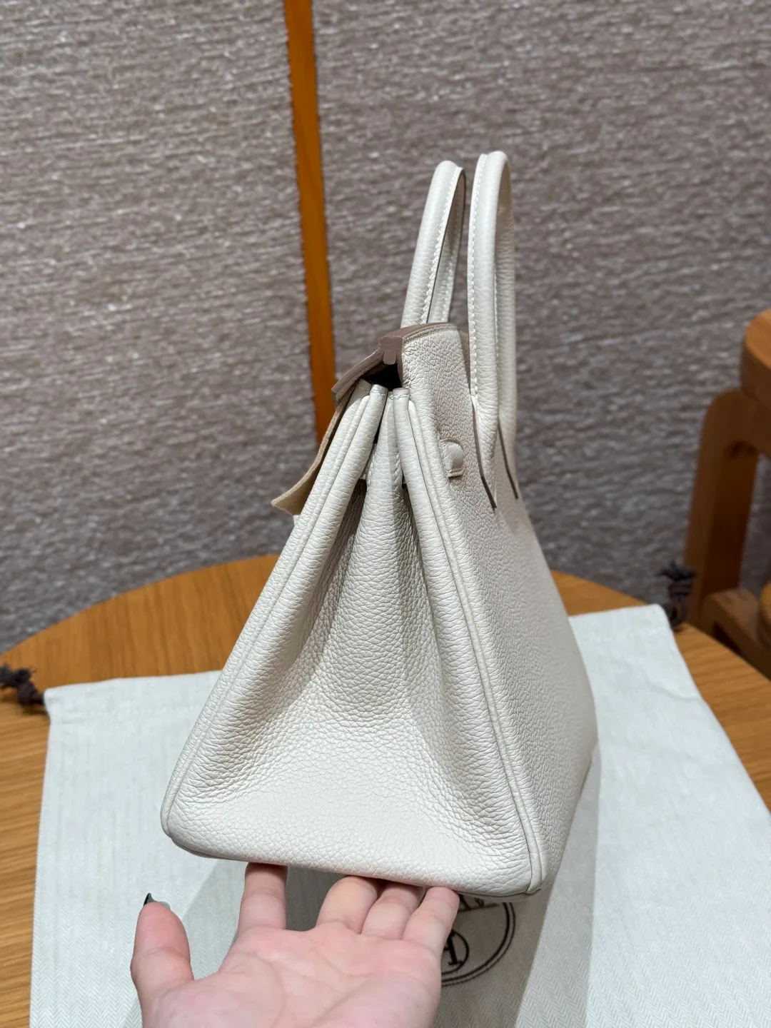 Фурнитура золотого цвета с покрытием 18K и внешний шов подчеркивают характерный стиль Birkin, добавляя изделию шарм ручной работы. Индивидуальная заказная отделка включает ручную набивку заклепок и гравировку. Каждое изделие уникально благодаря полной ручной сборке и настройке.