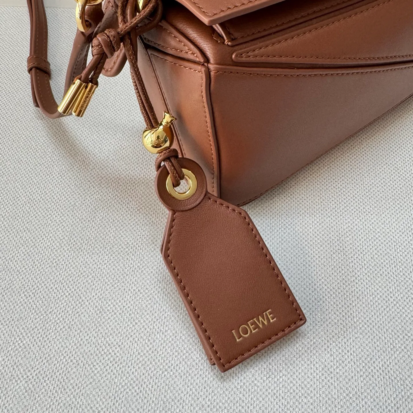 Декоративный логотип LOEWE на сумке в виде горячего тиснения или серебряного декора; есть скрытый карман и металлические ножки для защиты дна. Внутренняя подкладка из нубуковой кожи с тиснением Anagram и табличкой с выгравированным названием бренда.