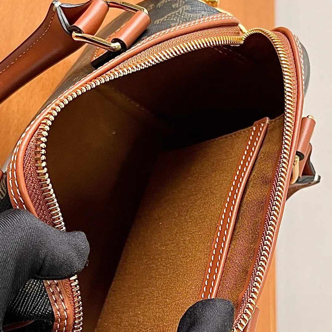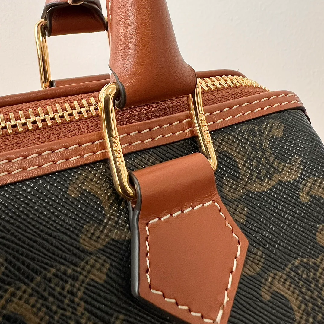 Клатч имеет тканевую подкладку и кожаную отделку по кромкам. Основное отделение закрывается на молнию, внутри есть карман на молнии для мелких вещей. Размеры составляют примерно 19,5 × 14 × 7 см, а кожаная ручка длиной 8 см обеспечивает комфорт при использовании. Этот аксессуар впишется как в повседневный образ, так и в более элегантные наряды.