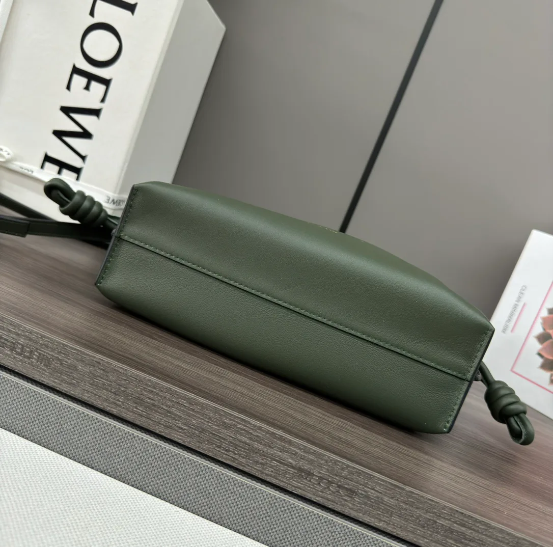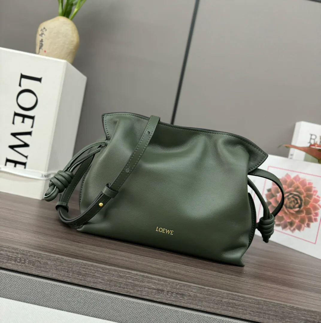 Сумка оснащена простой магнитной застёжкой для удобного открытия и закрытия. Фирменная шнуровка с закрученным узлом позволяет регулировать объём. Внутри достаточно места для маленького кошелька, телефона, блокнота формата A5, бутылки объёмом 0,5 л и очков. Сумку можно носить на плече, через плечо или держать в руке благодаря съёмному и регулируемому ремню. Дизайн минималистичный с акцентом на качество кожи и тиснение LOEWE.