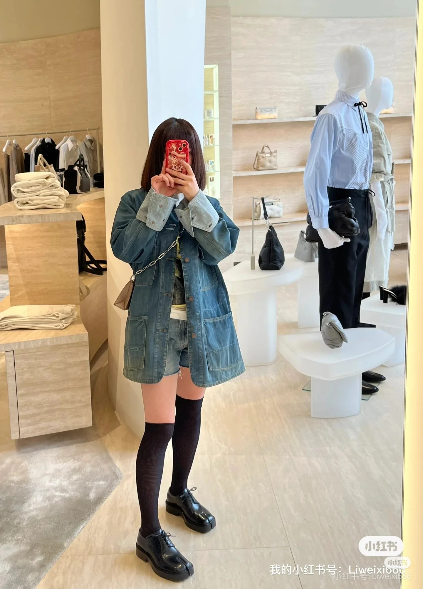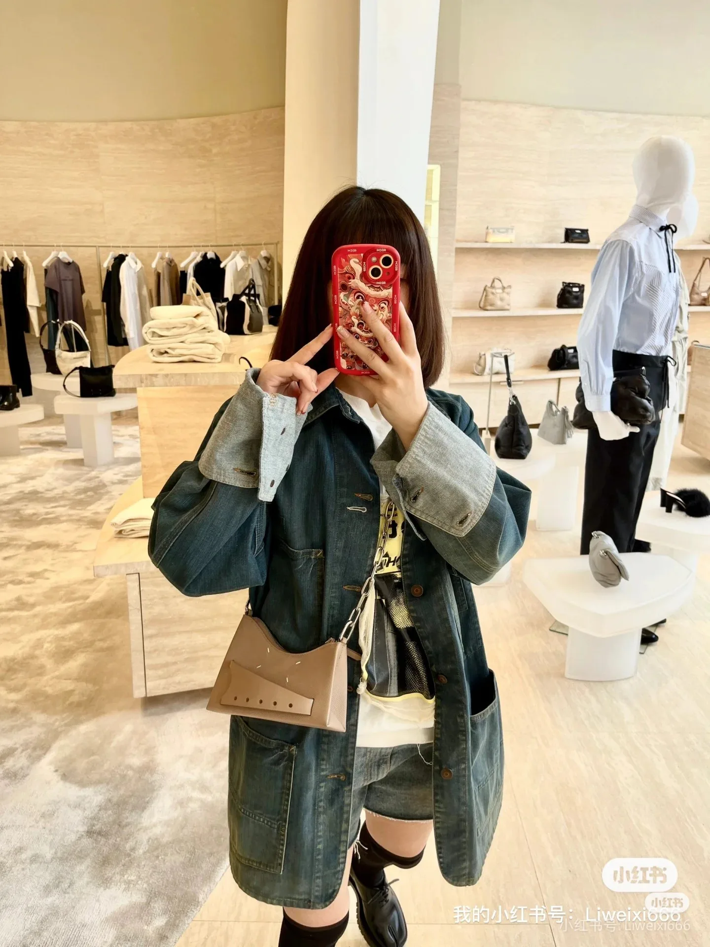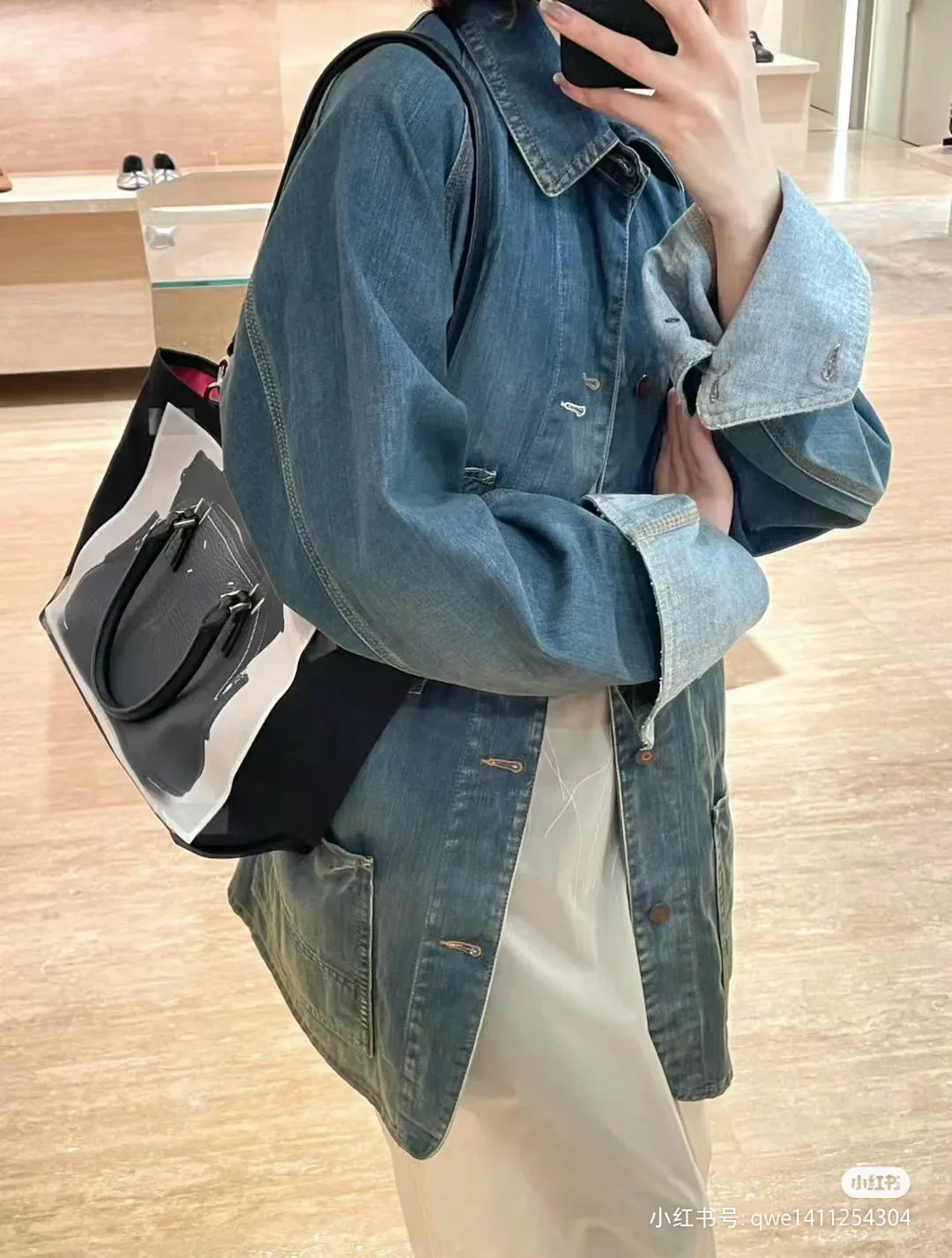 На жакете надета небольшая сумка кросс-боди коричневого цвета, оформленная декоративными элементами и ремнем-цепочкой, которая прекрасно дополняет образ. Удобный размер и стильный дизайн этой сумки делают ее идеальным аксессуаром для повседневного использования.