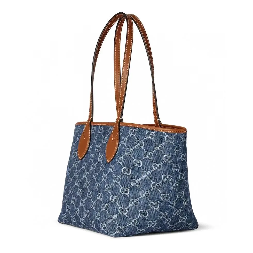 Эта маленькая сумка-тоут из синего денима размером примерно 22 см в длину, 19 см в высоту и 18 см в ширину. Компактные габариты делают её удобной для повседневного использования, дизайн легко сочетается с разными нарядами.