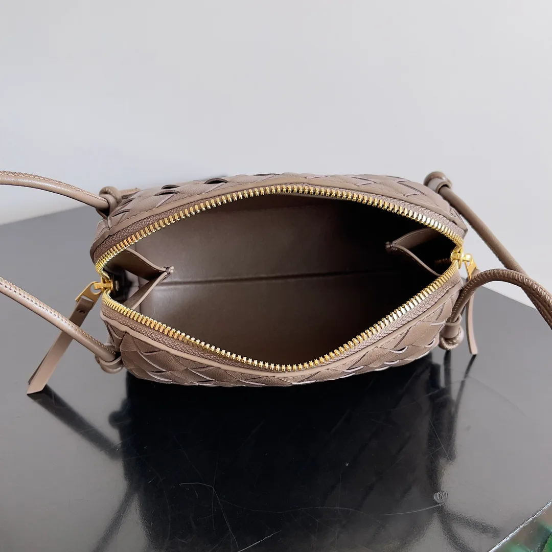 Сумка изготовлена в характерной плетёной текстуре BOTTEGA VENETA, придающей изделию элегантный и долговечный вид. Регулируемый ремень позволяет носить сумку через плечо или как кросс-боди, что делает её подходящей для городской моды и путешествий. Размеры сумки составляют 18,5 × 11,5 × 8,5 см.