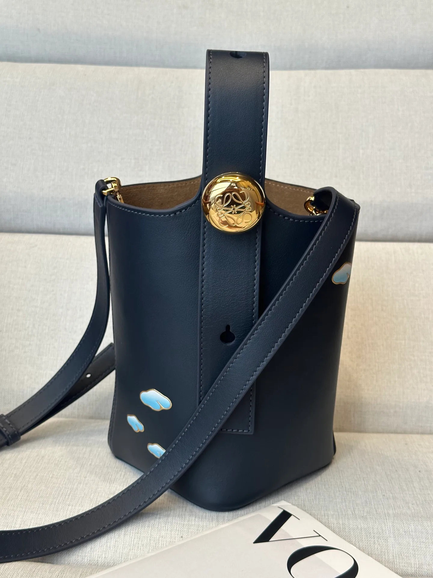 Сумка на ремне женская BOTTEGA VENETA — модель Pebble Bucket выполнена в виде мини-версии с лаконичными линиями. Аксессуар изготовлен из мягкой напа-кожи и украшен декоративным элементом в виде облака с золотистым контуром. Сумка является частью специальной коллекции к Новому году. Её можно носить на плече, в руках или как кросс-боди благодаря съёмному и регулируемому ремню с фирменным знаком. Внутри находится одно отделение и мягкая замшевая подкладка, застёжка на магните.