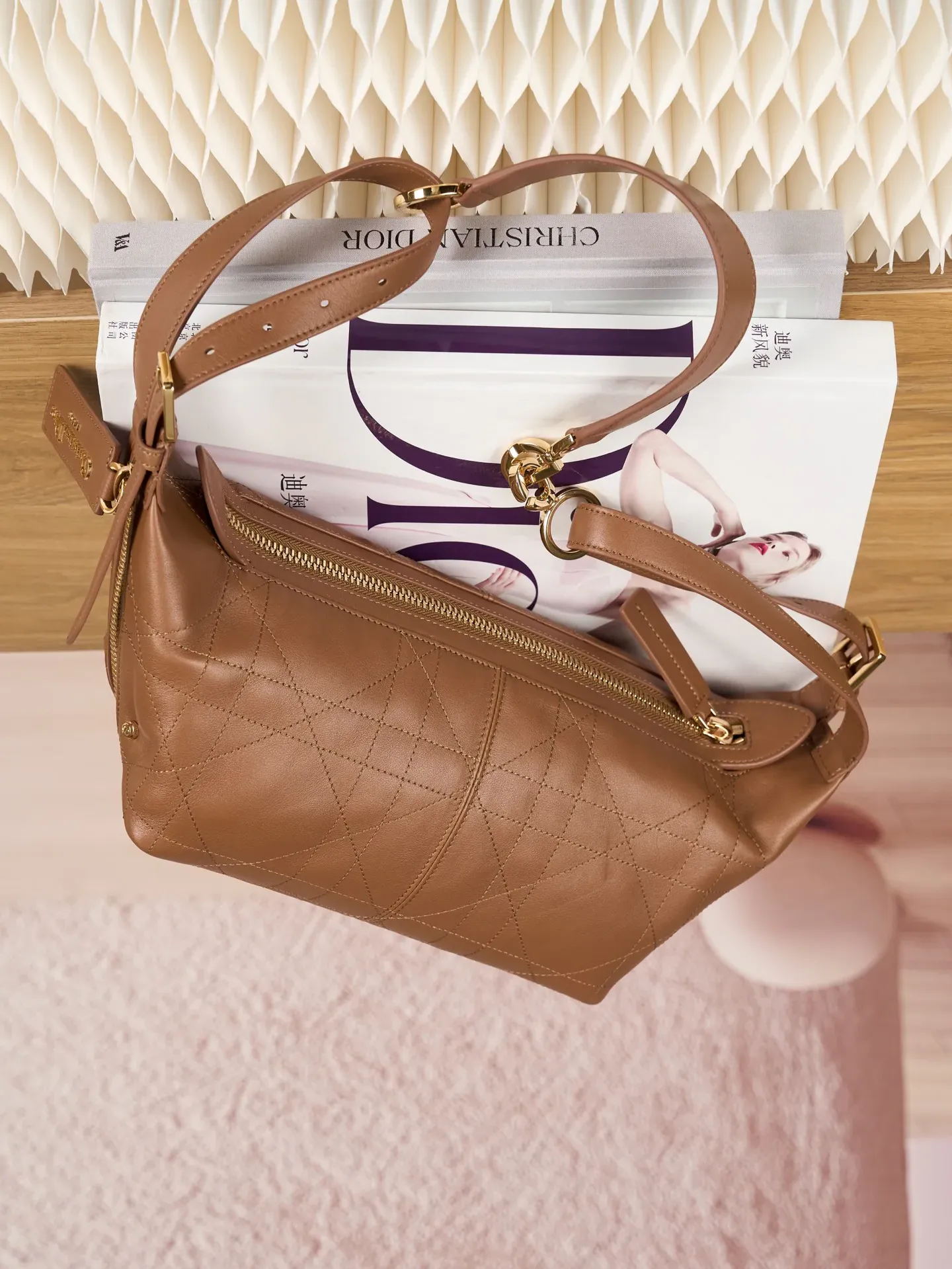 Сумка обладает главным отделением с внутренним карманом на молнии. Два внешних боковых кармана украшены крупными кожаными тягами-молниями и фурнитурой с надписью Christian Dior Paris. Регулируемая верхняя кожаная ручка и плечевой ремень позволяют носить сумку в руке, на плече или через тело.