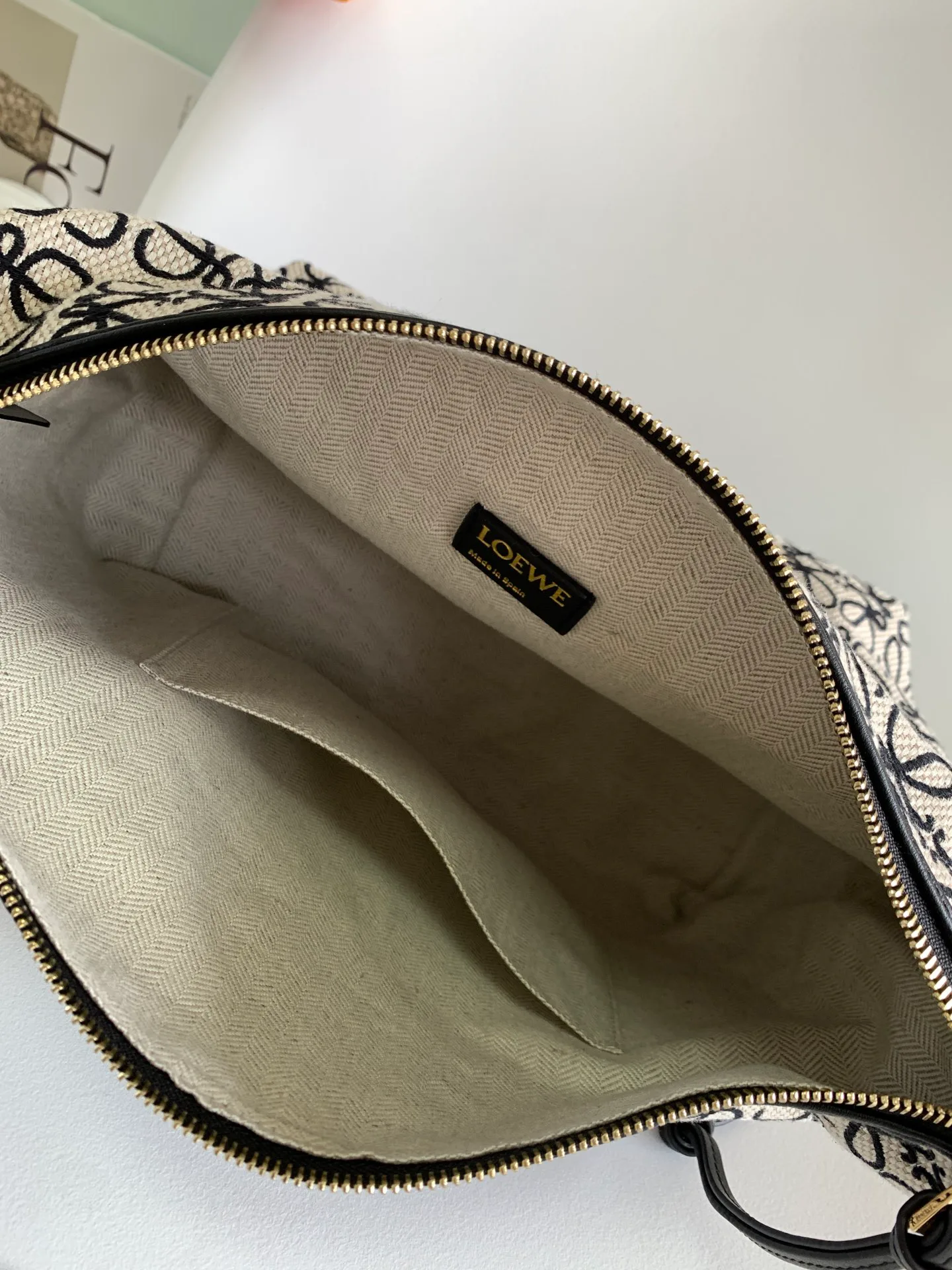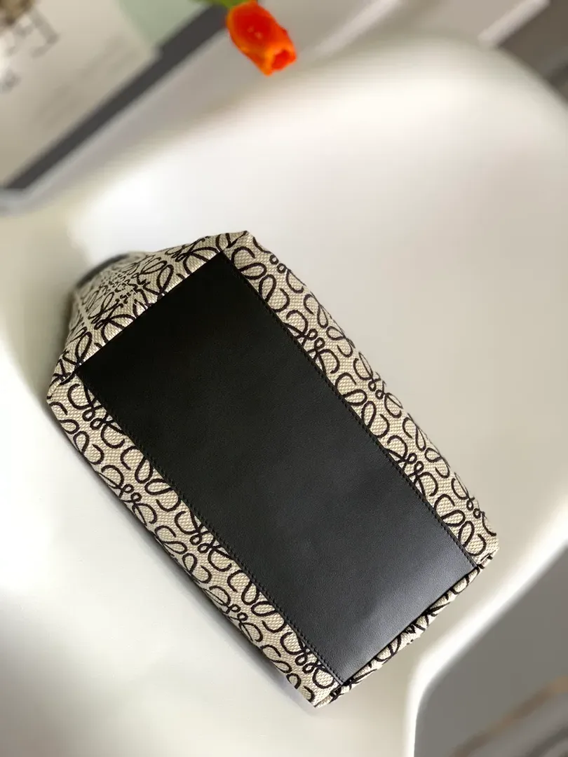 Внутри предусмотрена хлопковая подкладка с узором в виде елочки, а также вставные карманы для мелких предметов. Застежка на надежной молнии обеспечивает безопасность содержимого. Компактные габариты 27 × 21 × 16,5 см делают модель вместительной для повседневных вещей, а чистые линии и аккуратная фурнитура подчёркивают стиль бренда LOEWE.