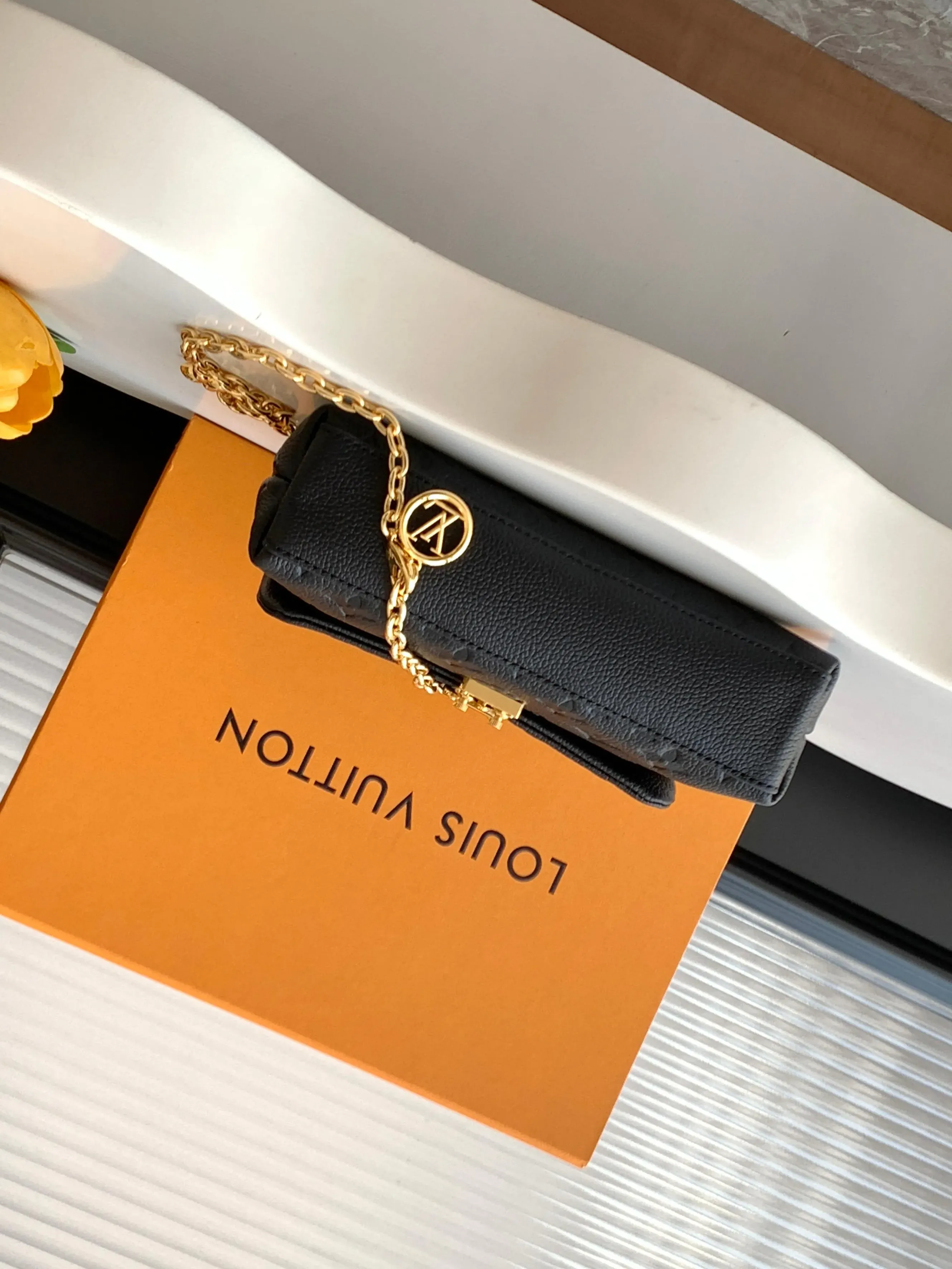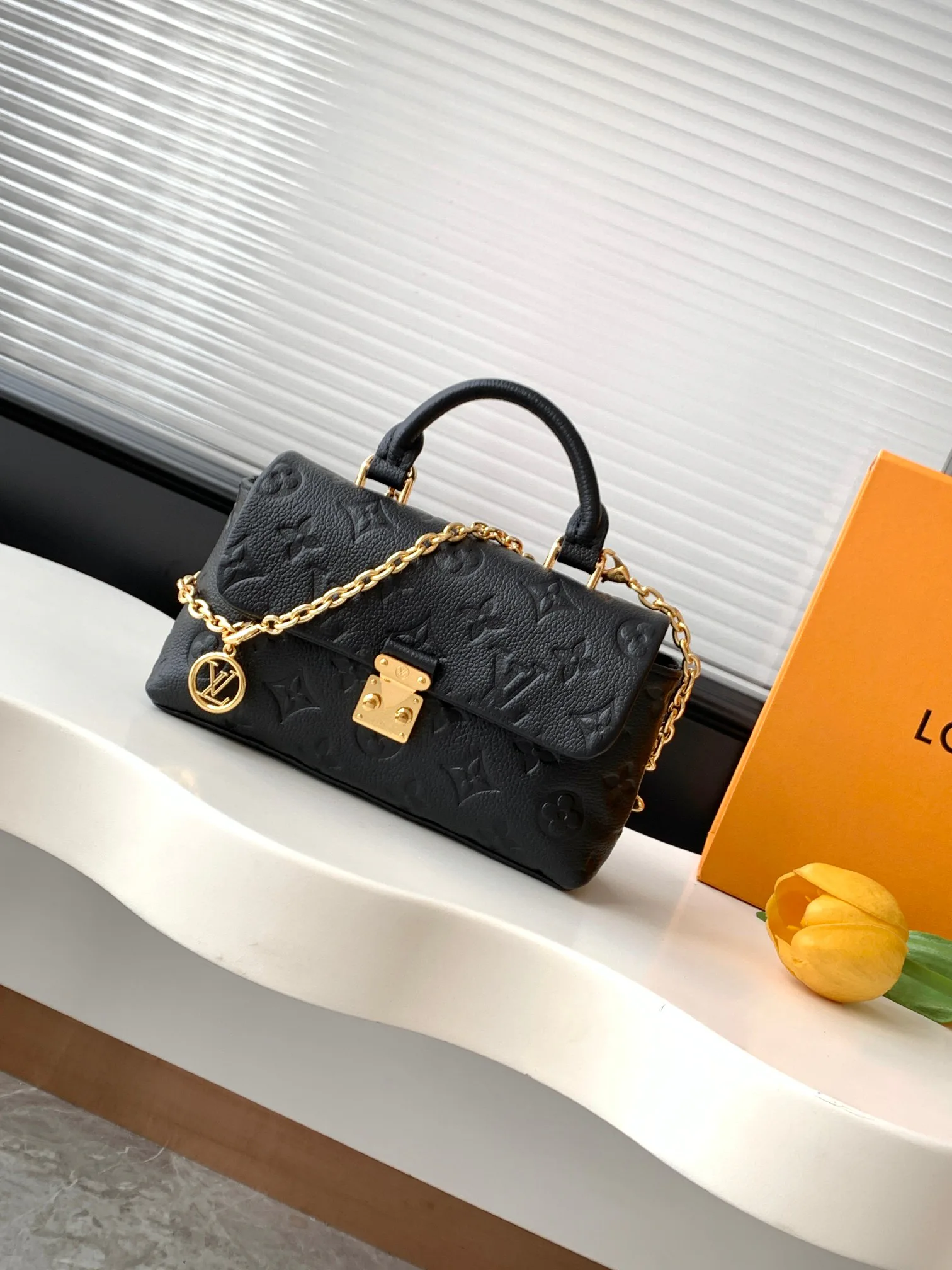 Сумка оснащена отделением с аккордеонной перегородкой и карманом для карт. У нее одна ручка и цепь средней длины около 56 см. Изделие производится во Франции, Испании, Италии или США, гарантируя высокие стандарты качества и дизайна.