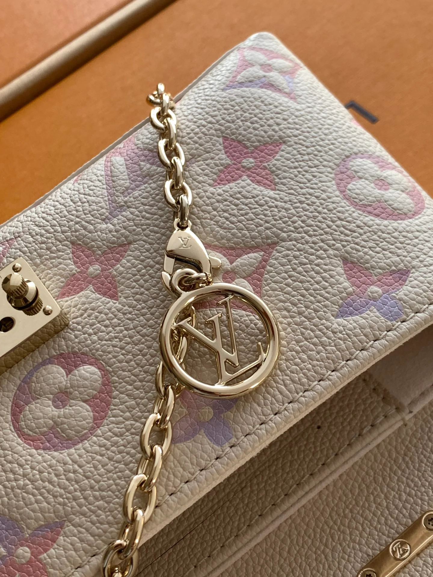Сумка оснащена классической S-lock застежкой и металлической фурнитурой из стали. Одна верхняя ручка позволяет носить ее в руке, а съемная цепь, регулируемая по длине, обеспечивает комфортное ношение через плечо или кросс-боди. Размеры сумки составляют 12.5 x 6 x 21 см, что делает ее подходящей для повседневного использования и светских мероприятий.