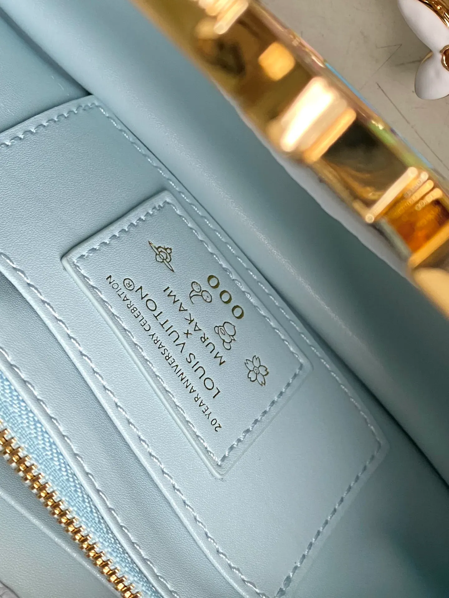 Дизайн сумки основан на лаконичной переизданной версии Capucines с цепочным ремнем. На цепи и акцентовых элементах повторяются буквы LV и цветы Monogram, подчеркивающие эстетические мотивы художника Мураками. Размеры сумки составляют 22 x 12 x 8 см, что обеспечивает компактность при ежедневном использовании и подходит для вечерних образов.