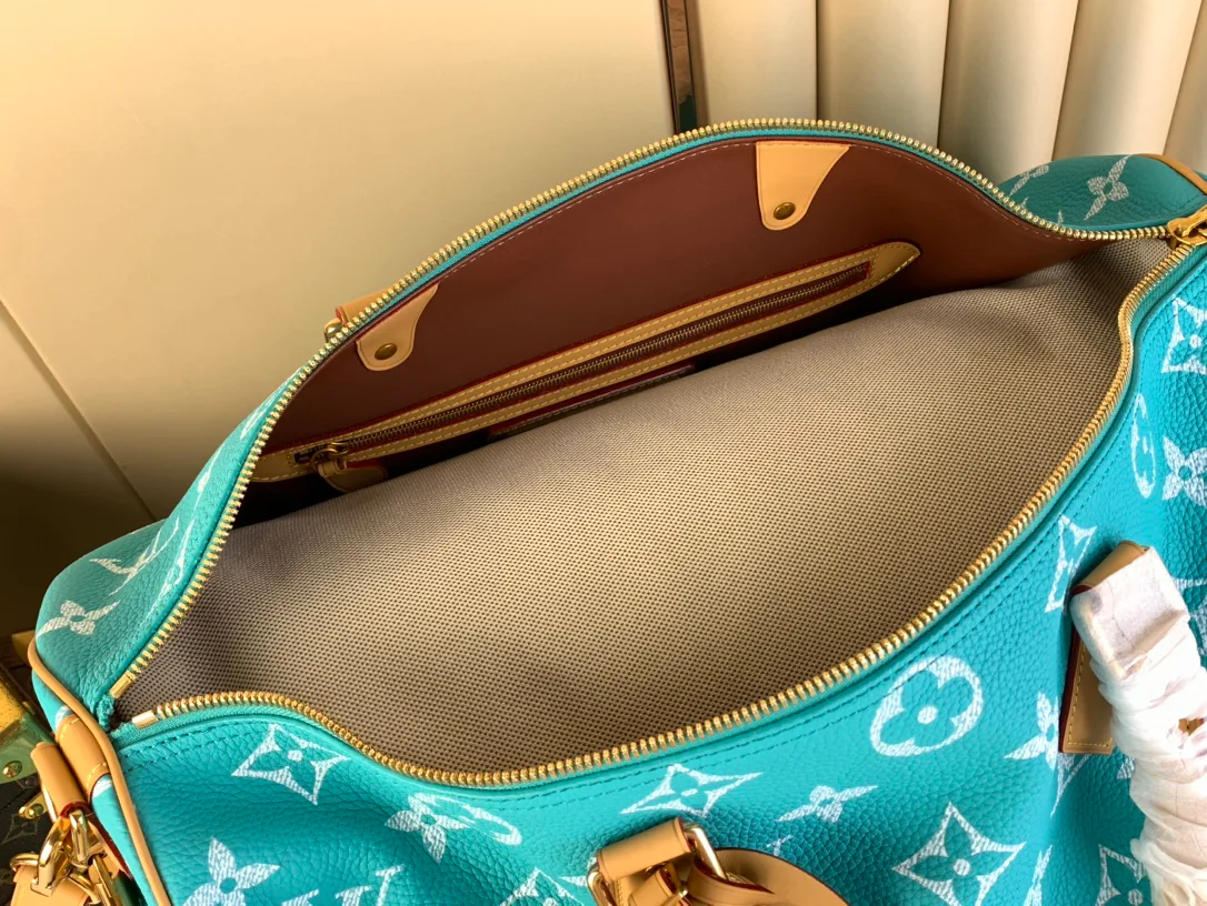 Сумка имеет удобную ручку из кожи с прокатанным эффектом и съемный регулируемый плечевой ремень, позволяющий носить её как через плечо, так и на плече. Размеры составляют 50 x 32 x 29 см, что делает её подходящей для документов и личных вещей. Доступна в нескольких цветах: красный, зелёный, коричневый, бирюзовый/лазурный.