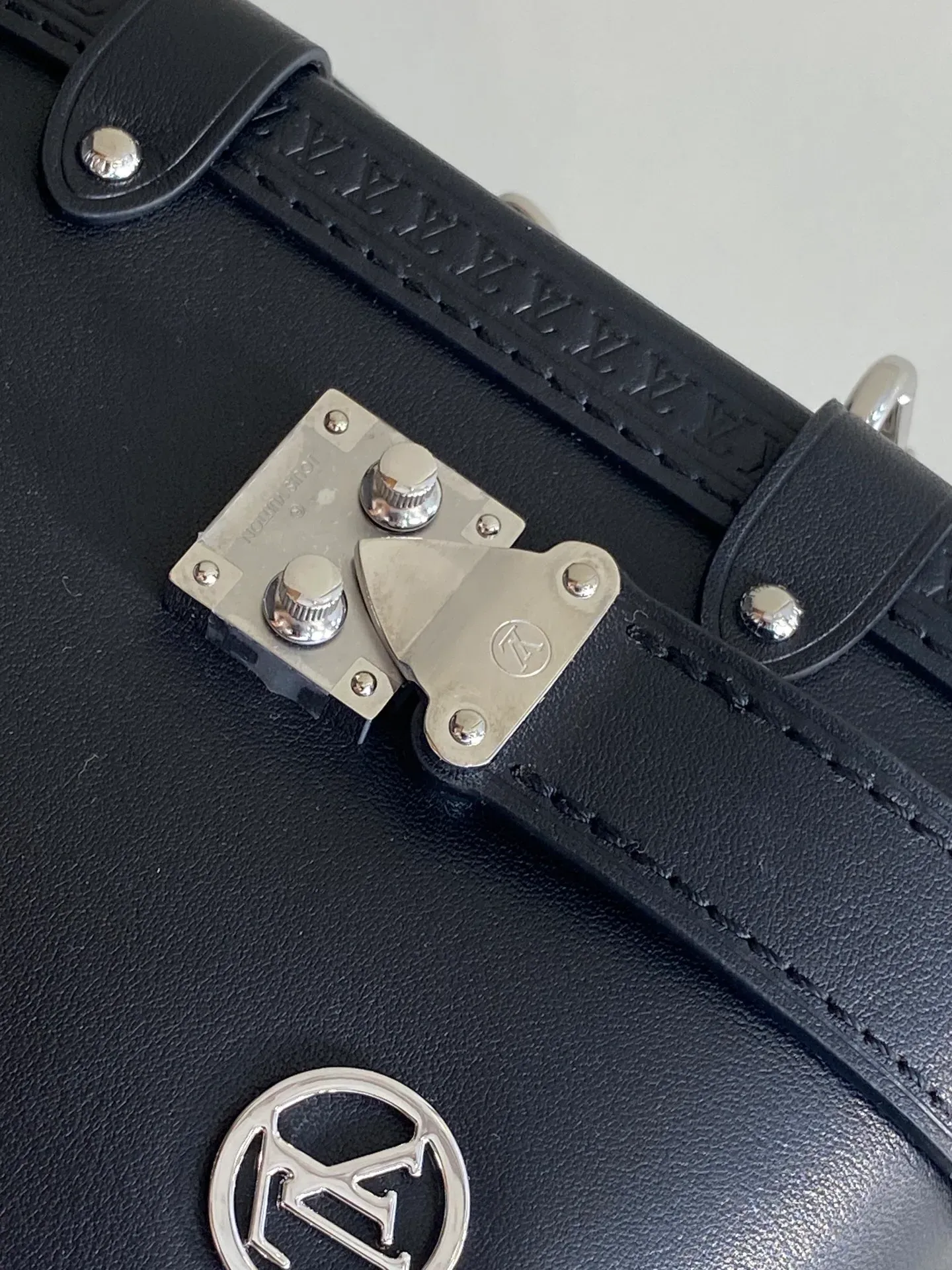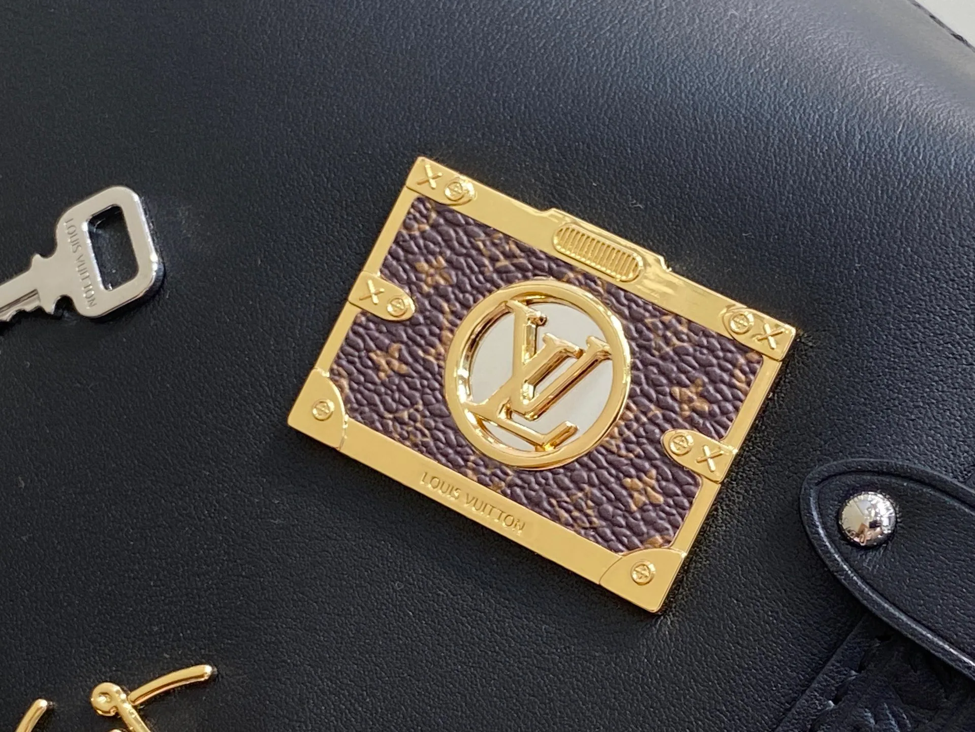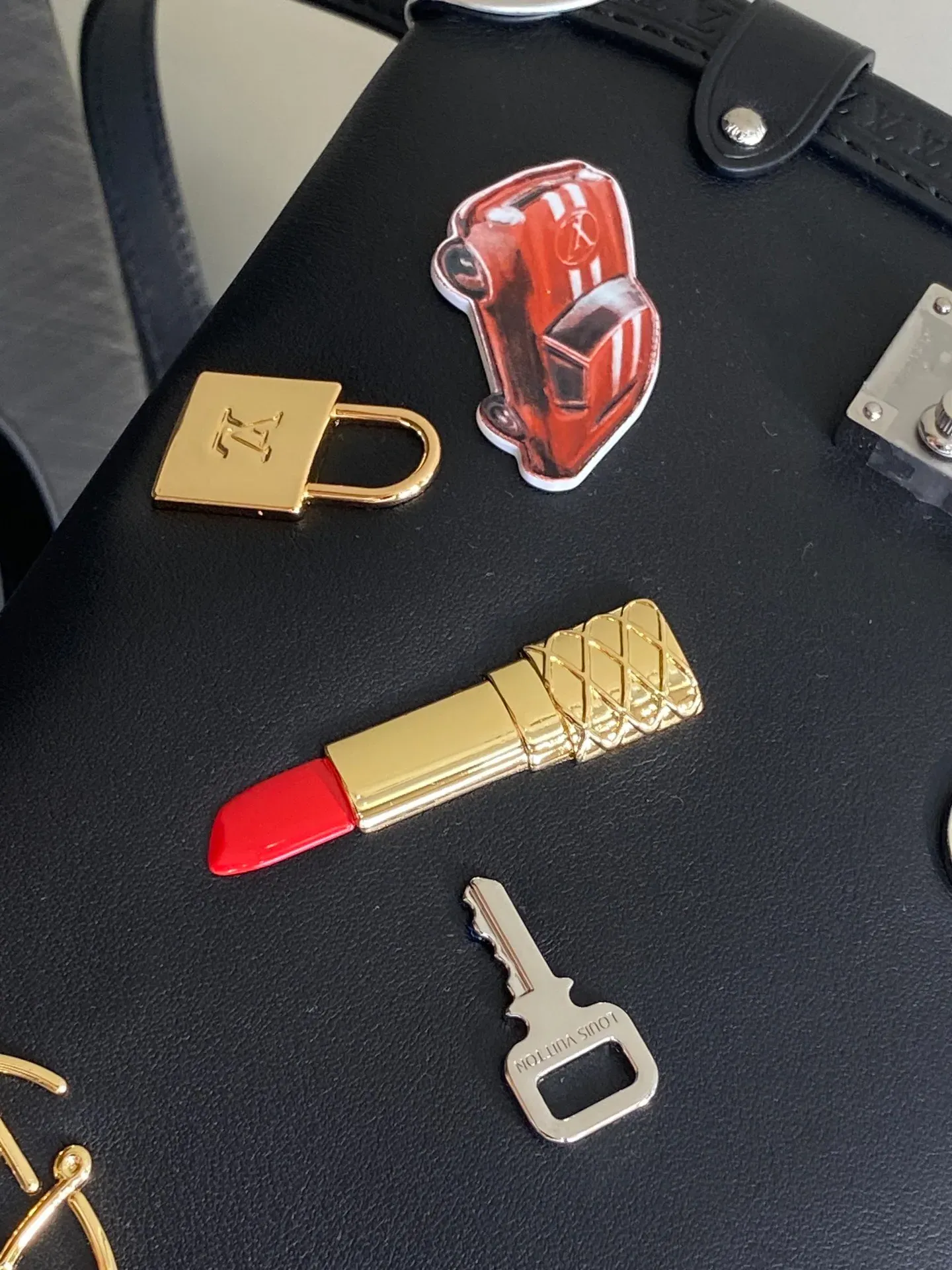 Сумка предназначена для ношения через плечо в качестве crossbody или ручной сумки, что позволяет подобрать удобный стиль под любой образ. Основной корпус черного цвета украшен разноцветными металлическими деталями в стиле LV Stickers, добавляющими креативности. Размеры составляют 16 x 8.5 x 23.5 см, что соответствует среднему формату для городского использования.