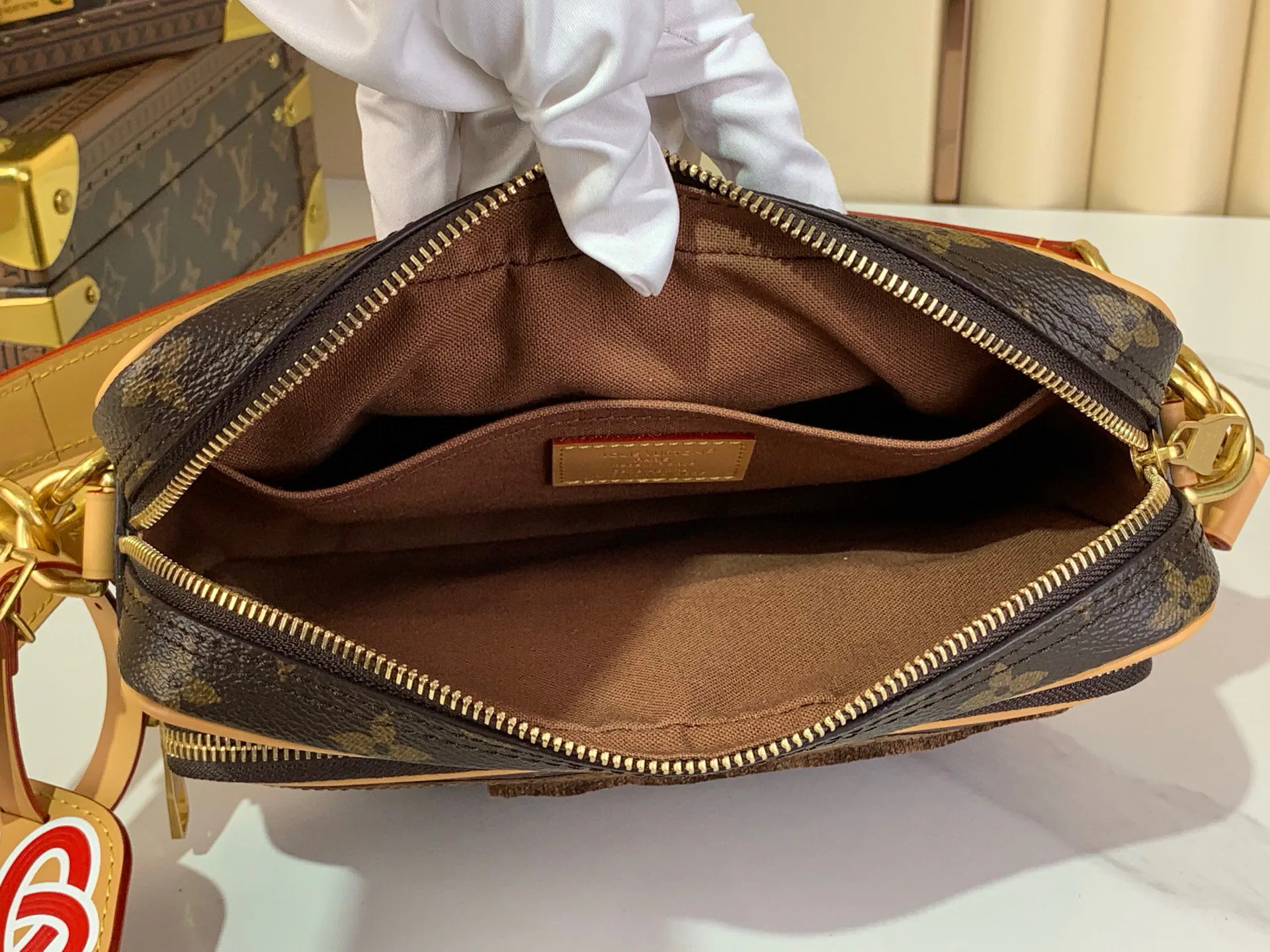 Сумка имеет съемную верхнюю ручку и плечевой ремень, что позволяет носить ее через плечо, кроссбоди или в руке. Размеры 17.5 x 11 x 25 см обеспечивают компактность и вместительность для повседневных вещей. Стильная цветовая схема монограммного рисунка с цветными вставками подходит для различных образов. Подкладка и фурнитура разработаны с учетом прочности и комфорта.