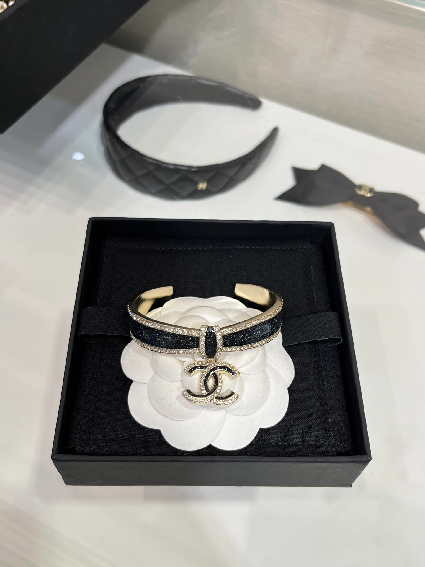 Бижутерия CHANEL — открытый браслет с бантом, выполненный из латуни с черной эмалью и гладкой полировкой, который удобно надевается на запястье. Дизайн украшают кристаллы и подвеска с двойной буквой C, создавая стильный акцент и образ, подходящий как для дневного, так и для вечернего наряда. Черно-золотистое оформление подчеркивает контраст кожи и добавляет благородный вид. Браслет комфортен в носке за счет открытого конца и умеренного веса, он хорошо сочетается с разными ансамблями повседневной моды. Уход прост: протрите мягкой тканью и избегайте агрессивных химических средств.